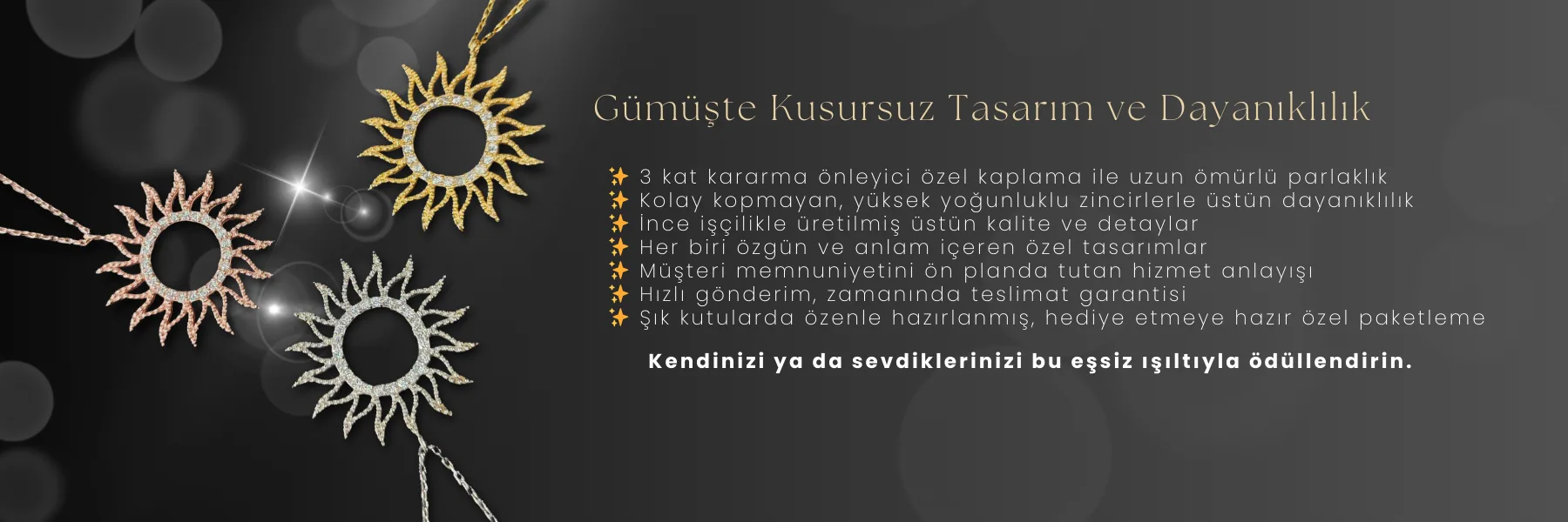 Düğün, nişan, mezuniyet gibi özel günlerinizde şık ve zarif görünmek için baget ve montür taş detaylı kolye, küpe ve yüzüklerimizi tercih edebilirsiniz. El işçiliği kalın zincirlerin kullanıldığı gümüş bilekliklerimiz ise kıyafetlerinize tamamlayıcı bir dokunuş katacaktır.