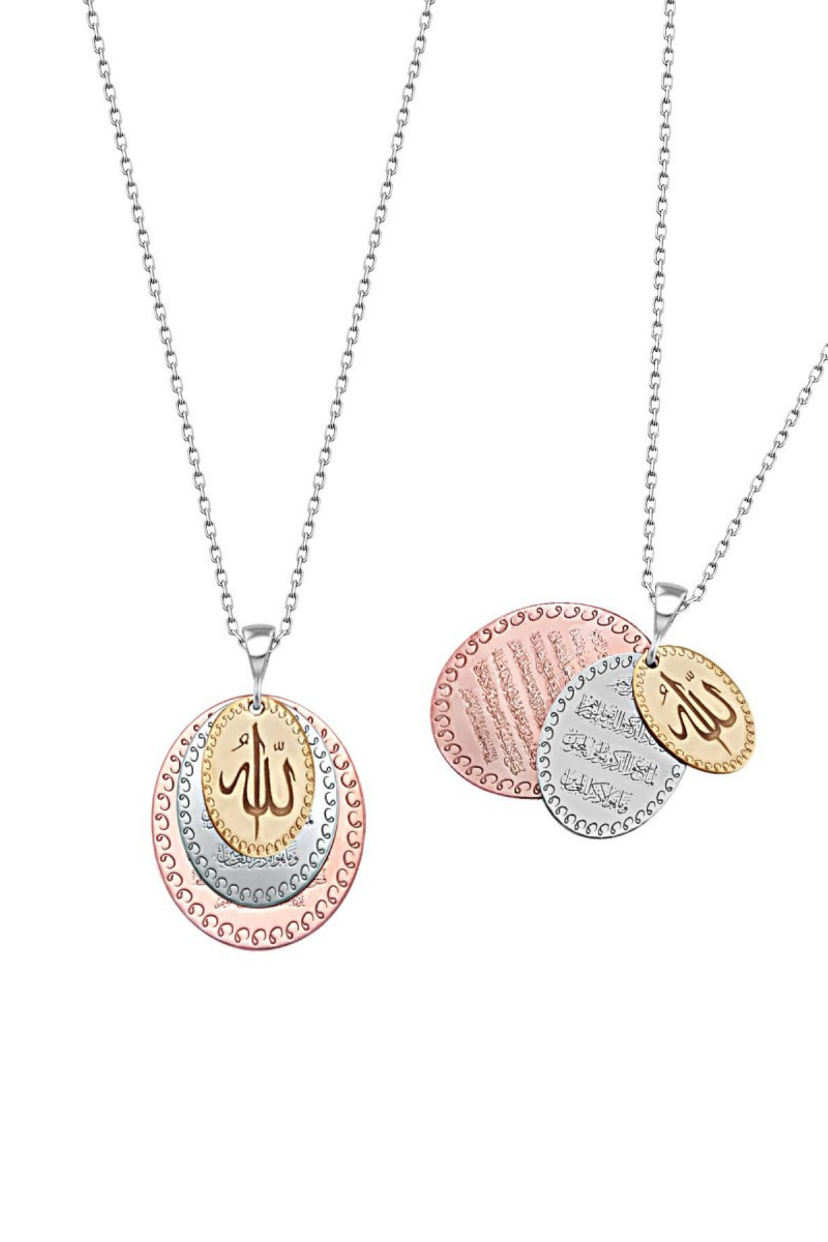 Merkezinde “Allah” lafzı bulunan, çevresinde Ayetel Kürsi ve nazar duası işlemeleri yer alan bu özel tasarım 925 ayar gümüş kadın kolye; manevi anlamı zarif bir takı formunda taşımak isteyenler için tasarlanmıştır. Katmanlı oval plaka yapısı ve üç renkli detay geçişi sayesinde hem klasik hem modern bir görünüm sunar.