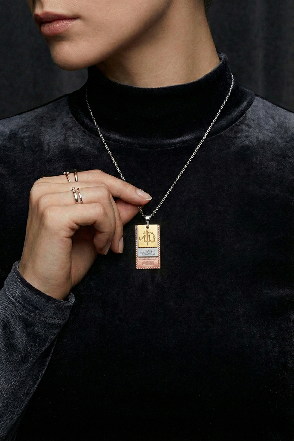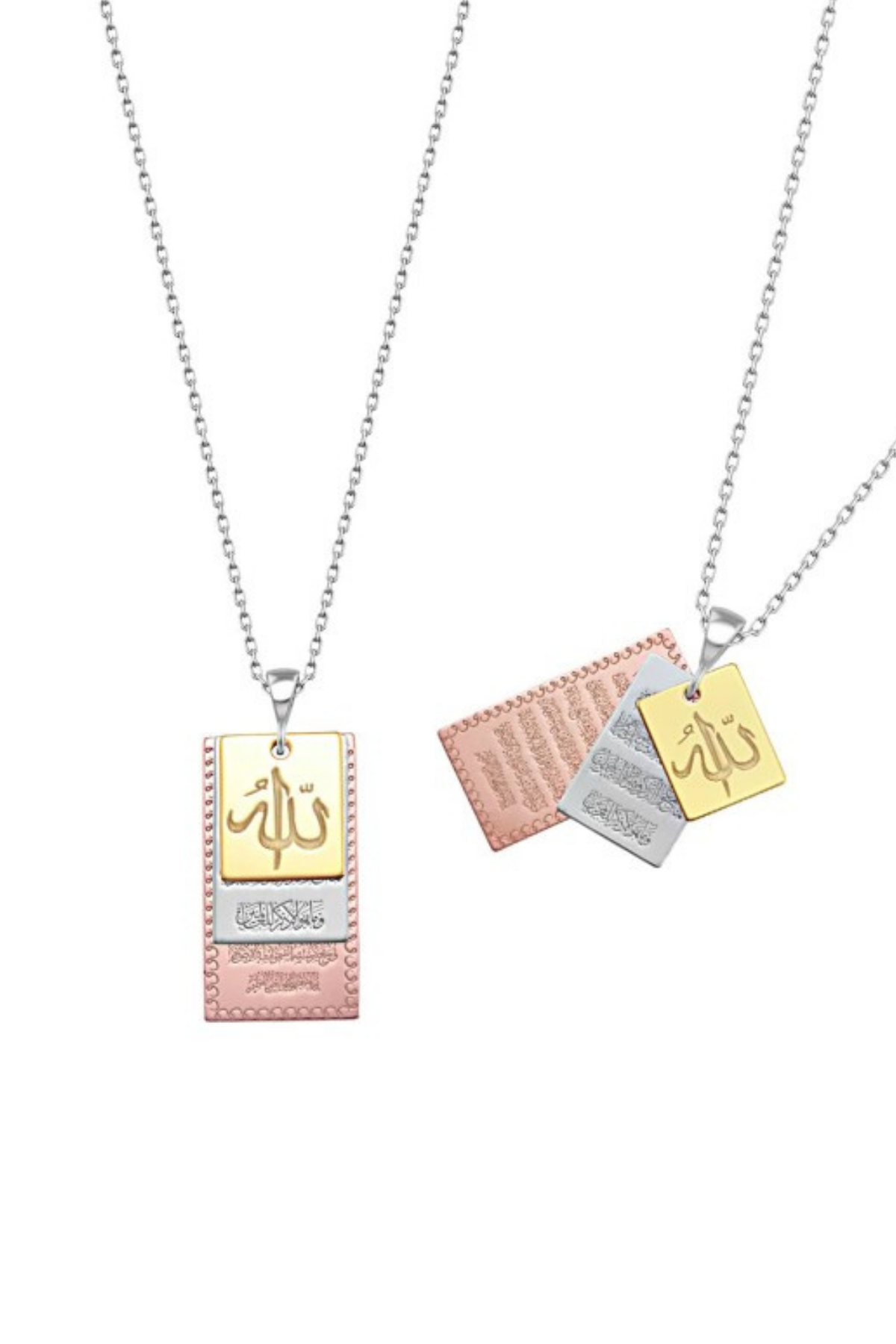 Merkezinde “Allah” lafzı bulunan, alt katmanlarında Ayetel Kürsi ve nazar duası işlemeleri yer alan bu 925 ayar gümüş kadın plaka kolye; güçlü manevi anlamı modern ve net hatlara sahip dikdörtgen tasarımla birleştirir. Katmanlı üç renkli plaka formu (gold, gümüş ve rose detaylı) kolyeye hem estetik derinlik hem de dikkat çekici bir görünüm kazandırır.