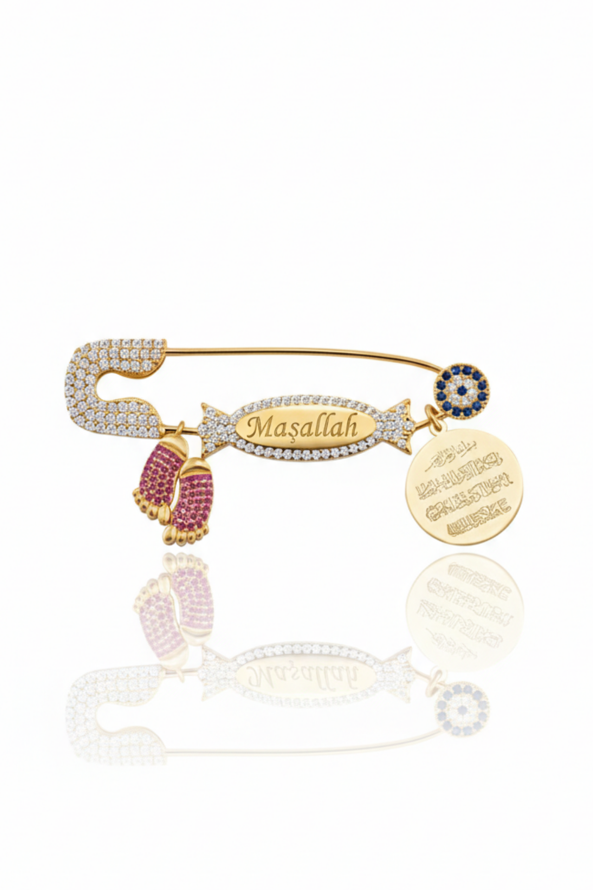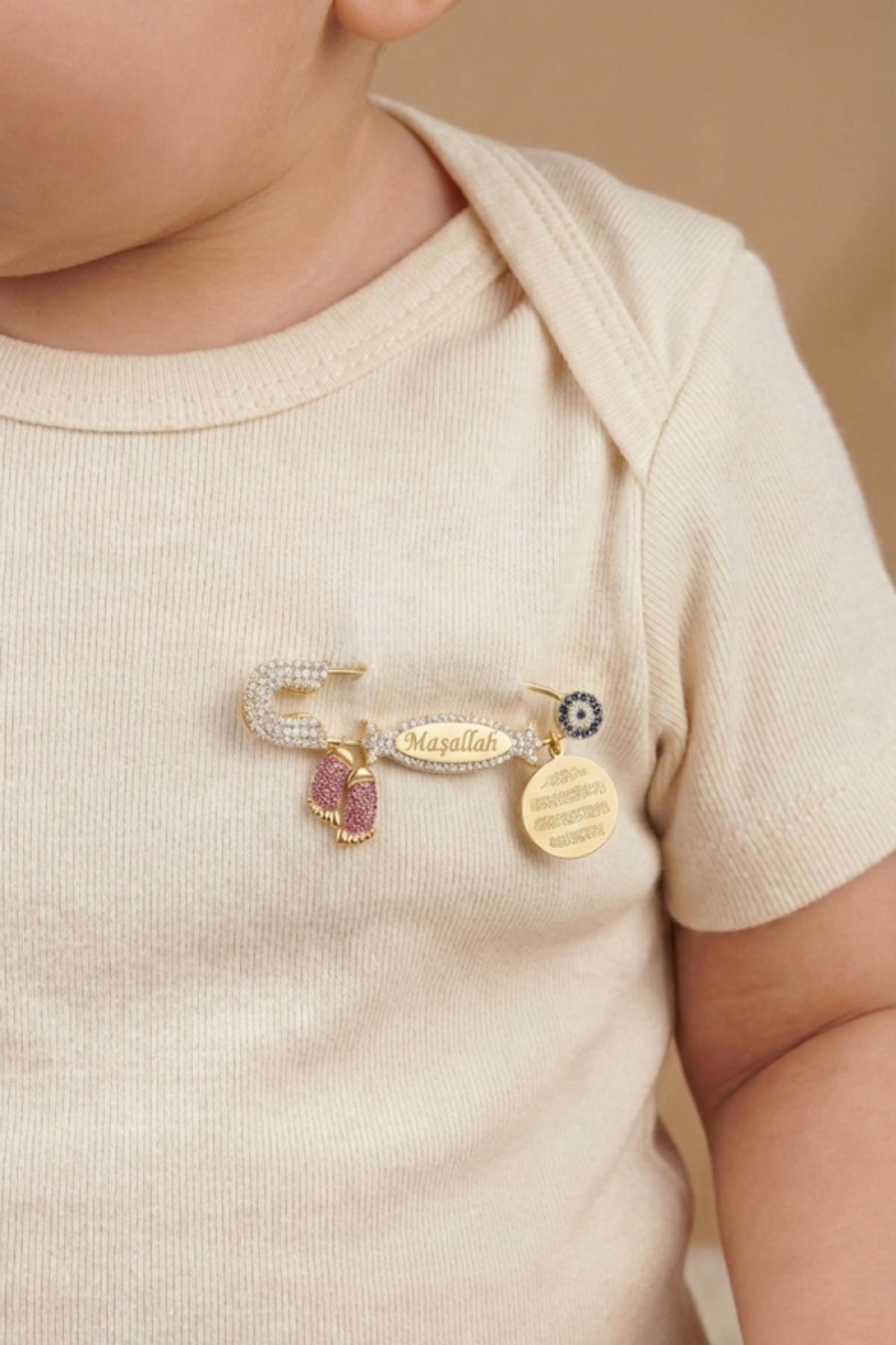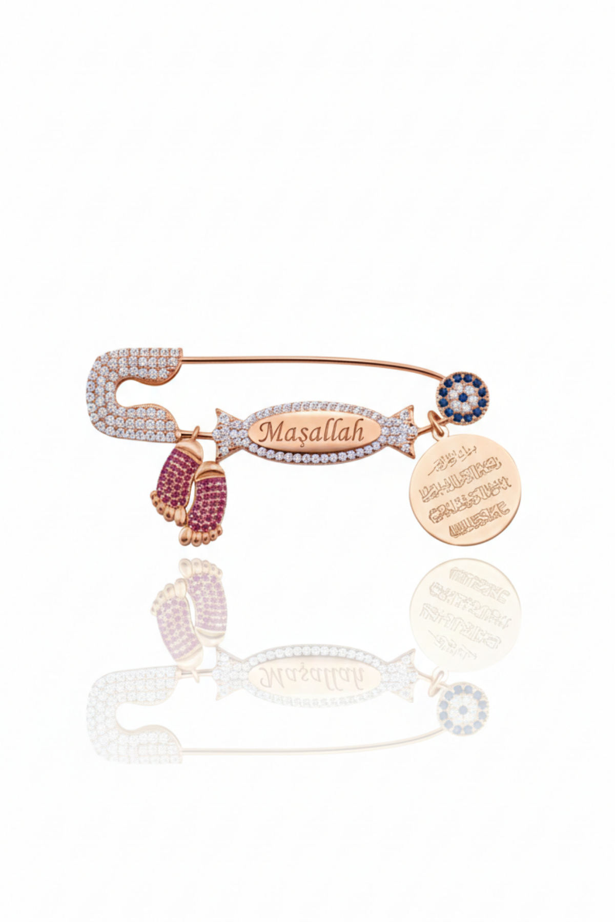 Canlı rengi ve derin sembolik anlamlarıyla öne çıkan bu kırmızı şeker figürlü Maşallah yazılı bebek yaka iğnesi, bebeğe duyulan sevgiyi, enerjiyi ve güçlü korunma niyetini temsil eder. Orta bölümde yer alan şeker formunda işlenmiş “Maşallah” yazısı, nazardan korunma duasını zarif bir tasarımla birleştirirken; yanında bulunan Nazar Ayeti yazılı yuvarlak plaka manevi korumayı tamamlayıcı bir unsur olarak öne çıkar. Mavi taşlı nazar boncuğu detayı ise geleneksel nazar inancının güçlü bir sembolüdür.