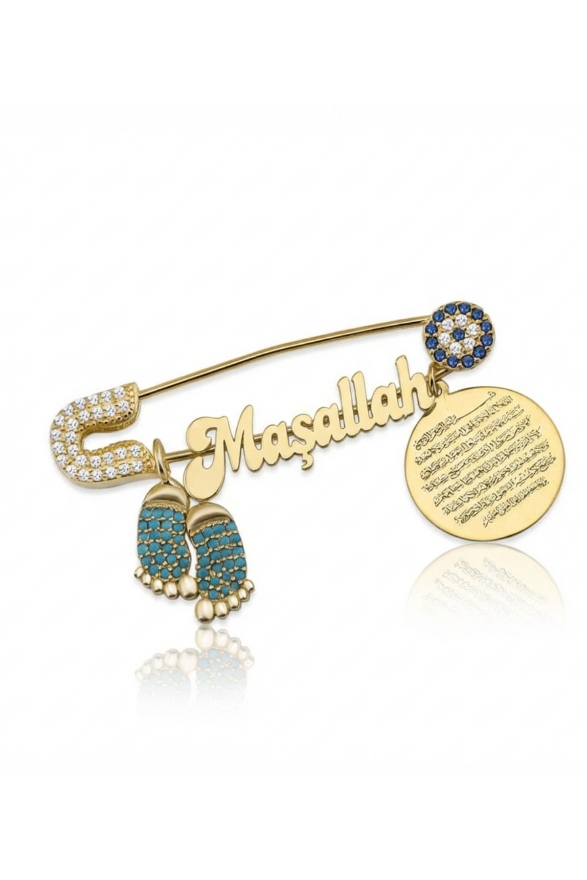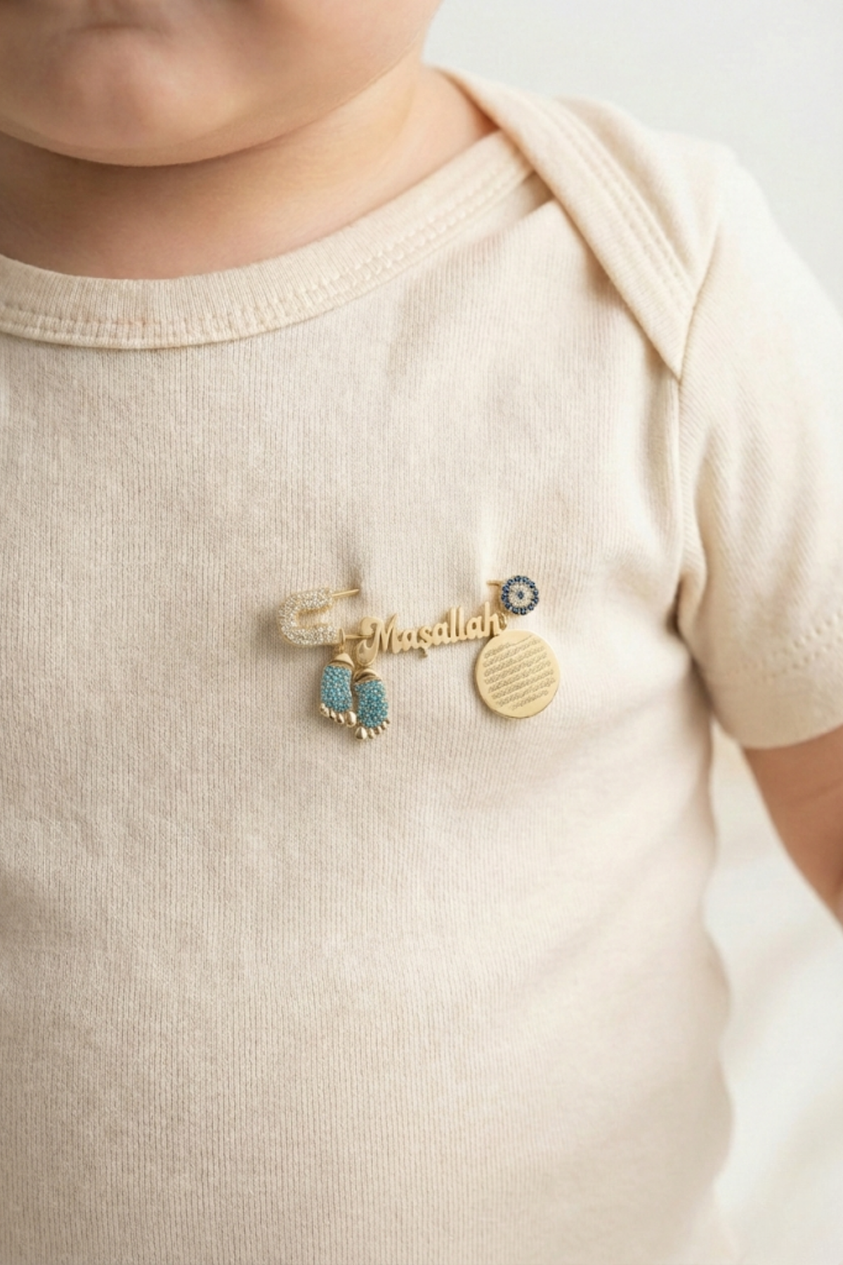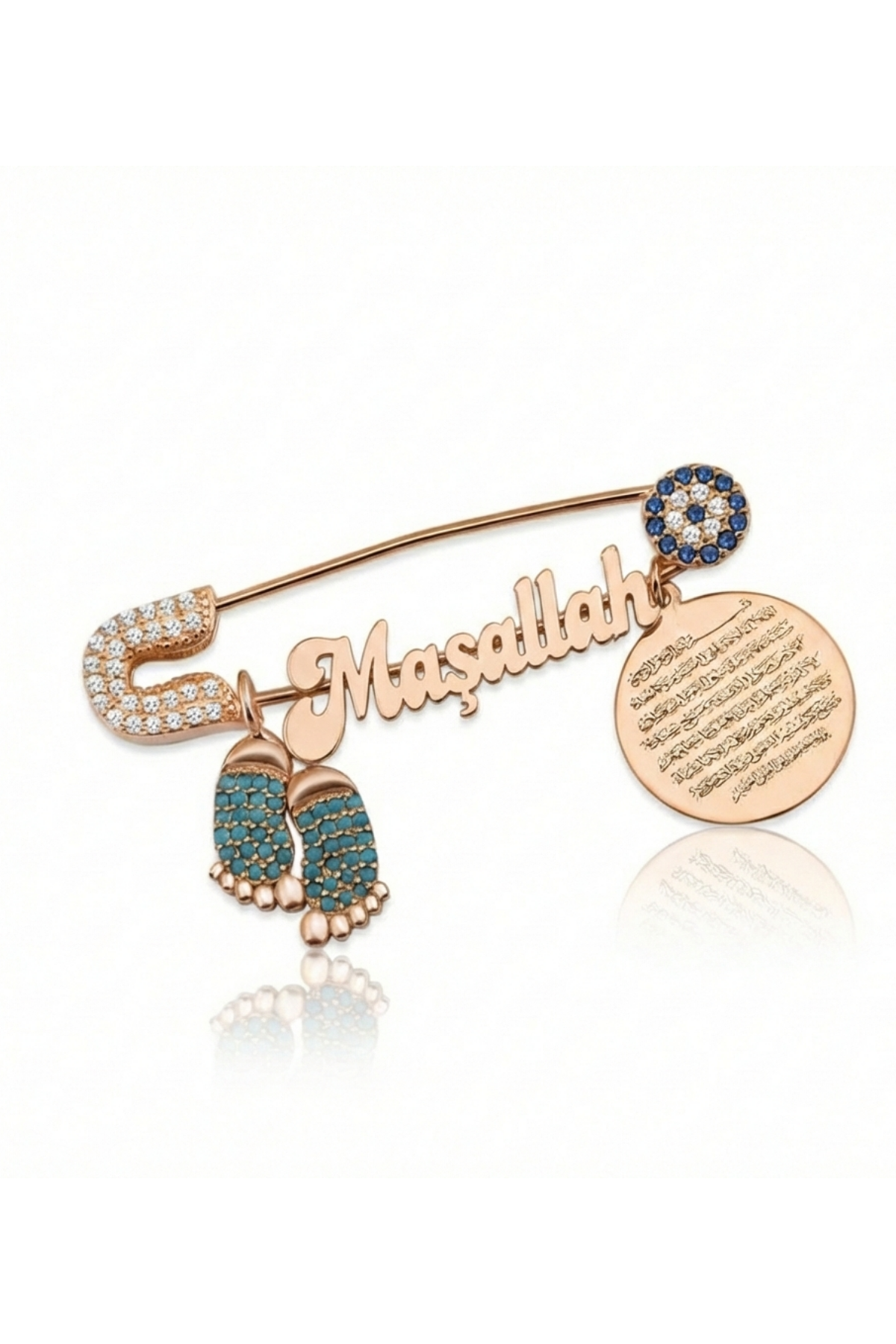 Ürün üzerinde yer alan “Maşallah” yazısı, nazara karşı korunma niyetiyle yüzyıllardır kullanılan güçlü bir ifadedir. Yanındaki yuvarlak plakada işlenen Nazar Ayeti (Kalem Suresi 51–52. Ayetler) ise İslam kültüründe manevi koruyuculuğuyla bilinir ve özellikle bebek aksesuarlarında tercih edilir.