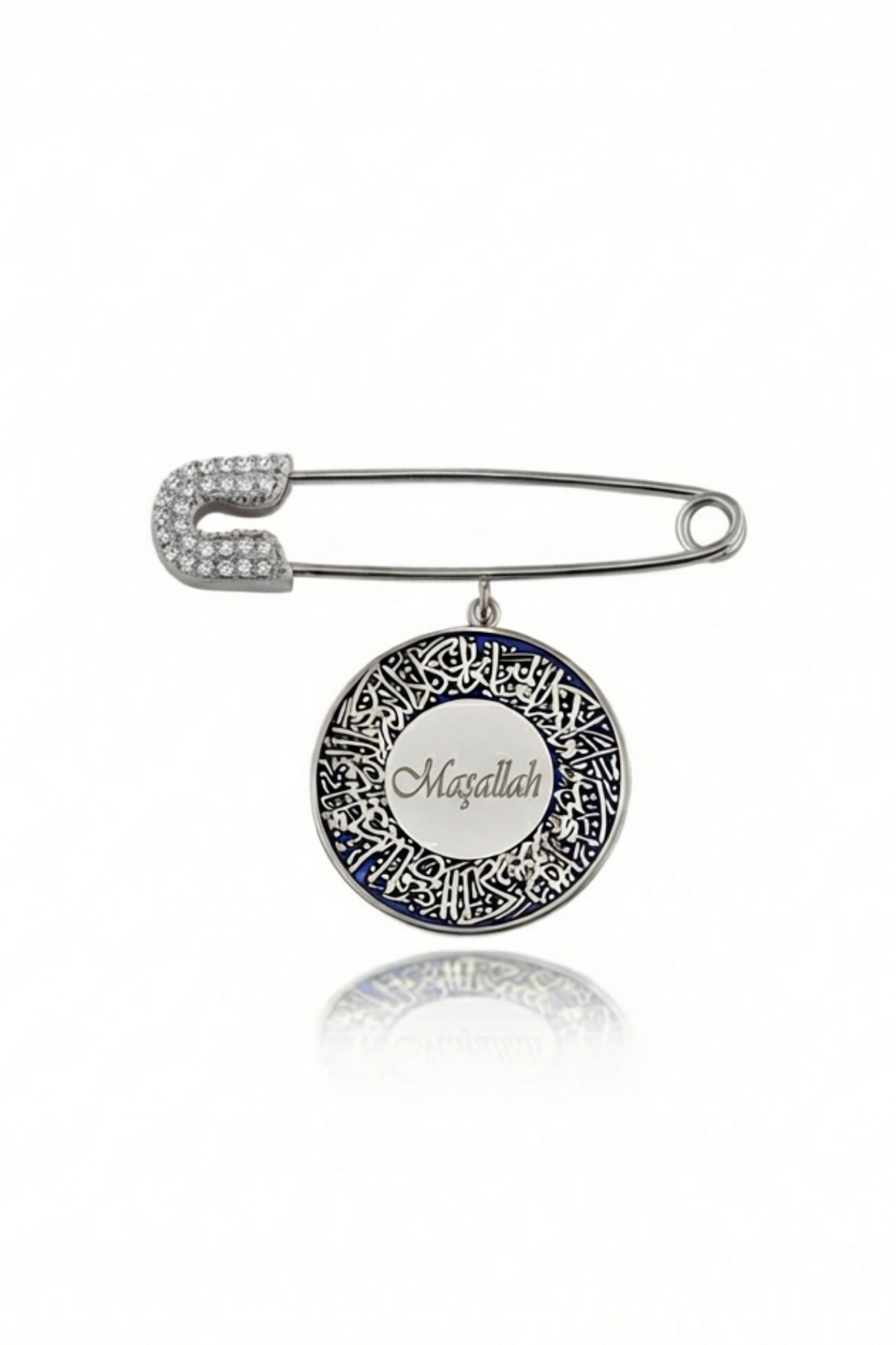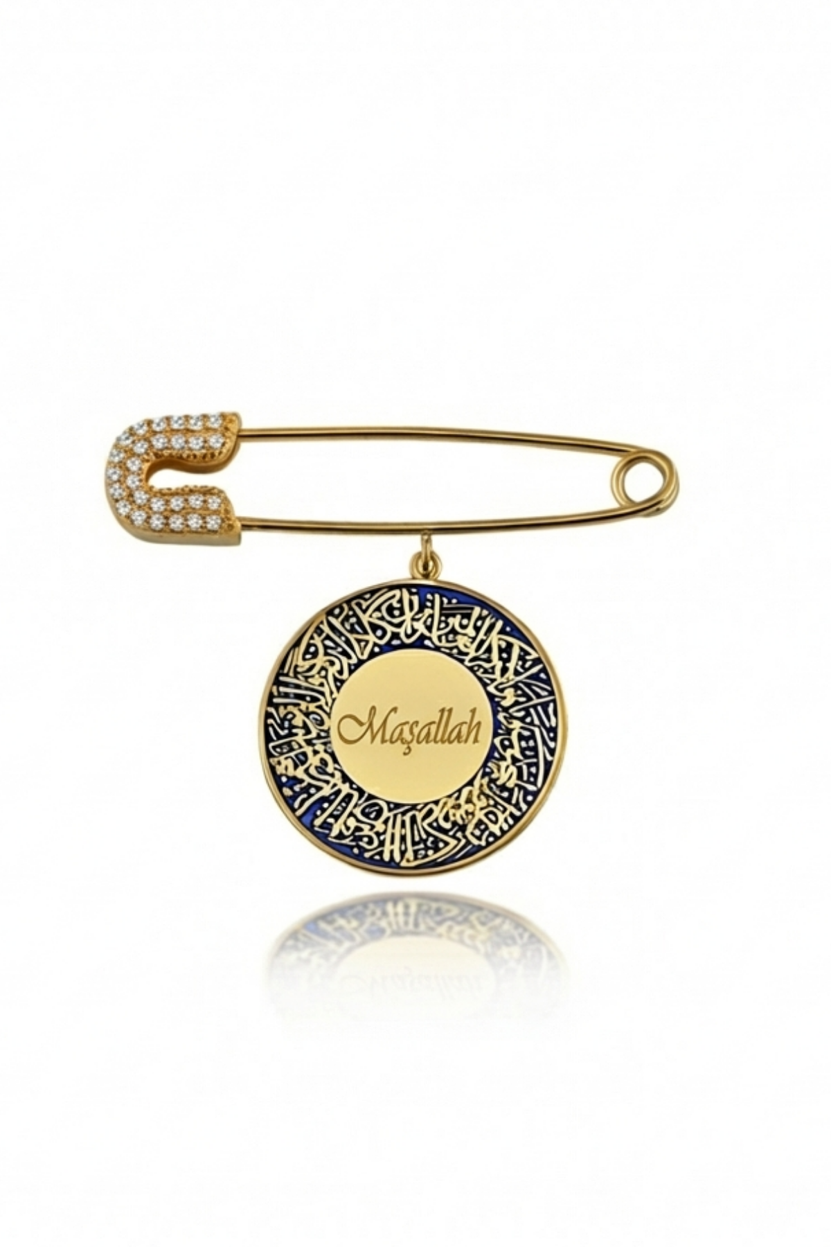 Maşallah, hayranlık ve koruma niyetini ifade ederken; Nazar Ayeti (Kalem Suresi 51–52. Ayetler) kötü enerjilere ve nazara karşı manevi bir kalkan olarak kabul edilir. Bu yaka iğnesi, bebeğe iyi dilek, korunma ve bereket temennisiyle takılan sembolik ve değerli bir aksesuardır.