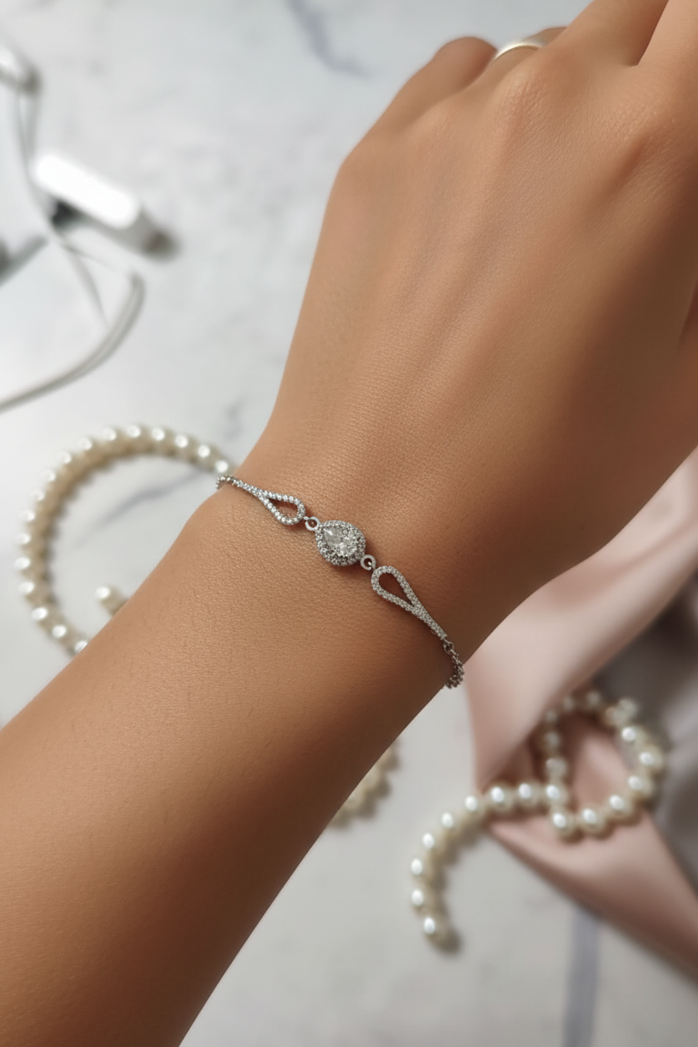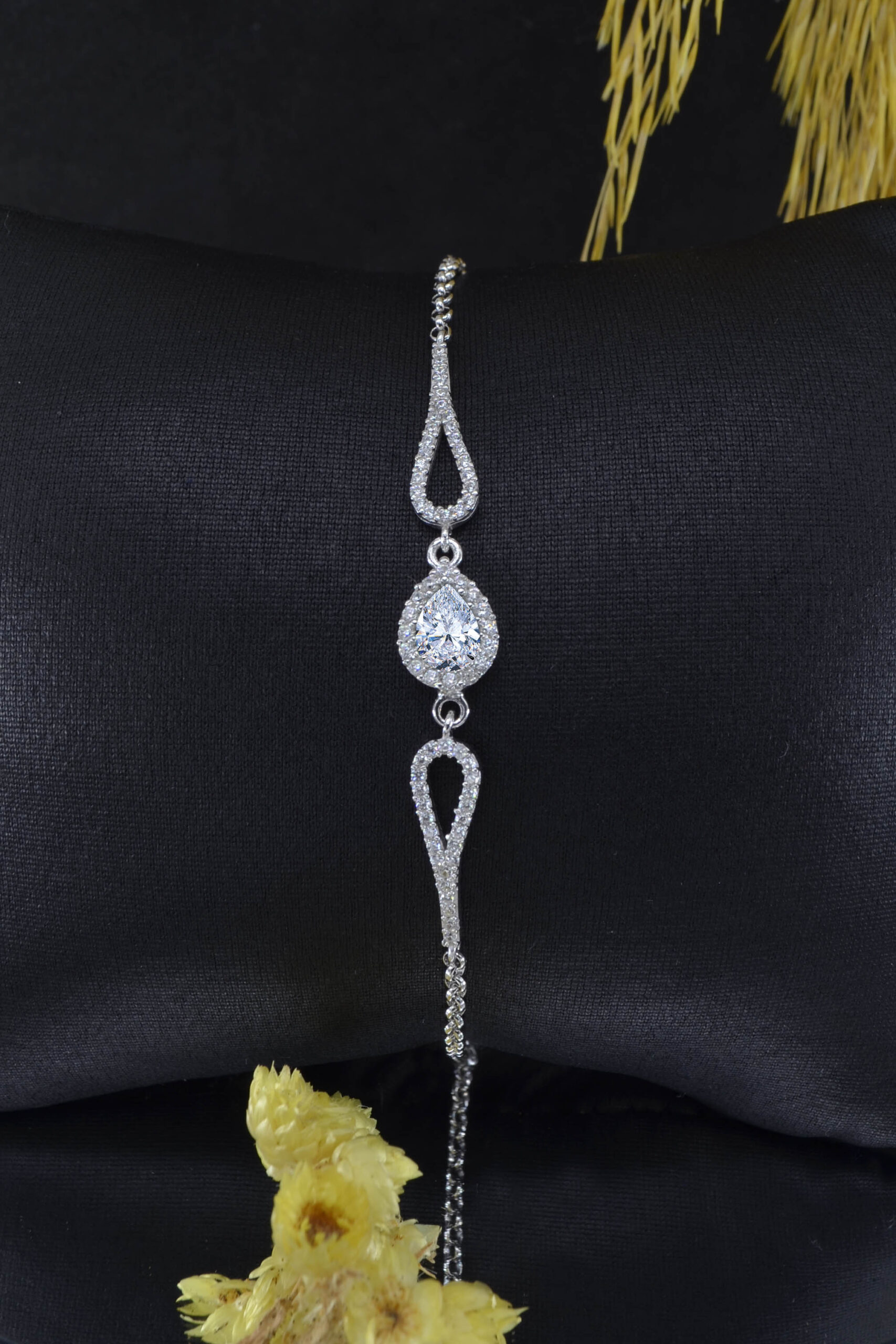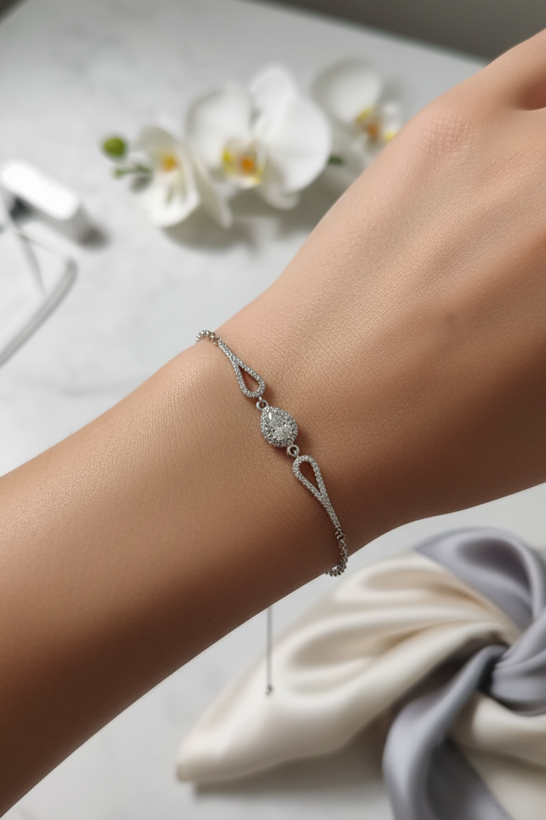 Beyaz Damla Taşlı Kadın Ayarlanabilir 925 Ayar Gümüş Bileklik