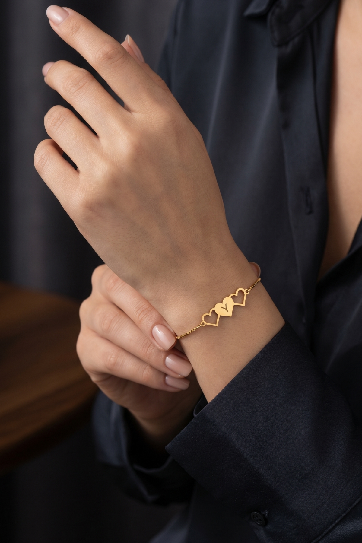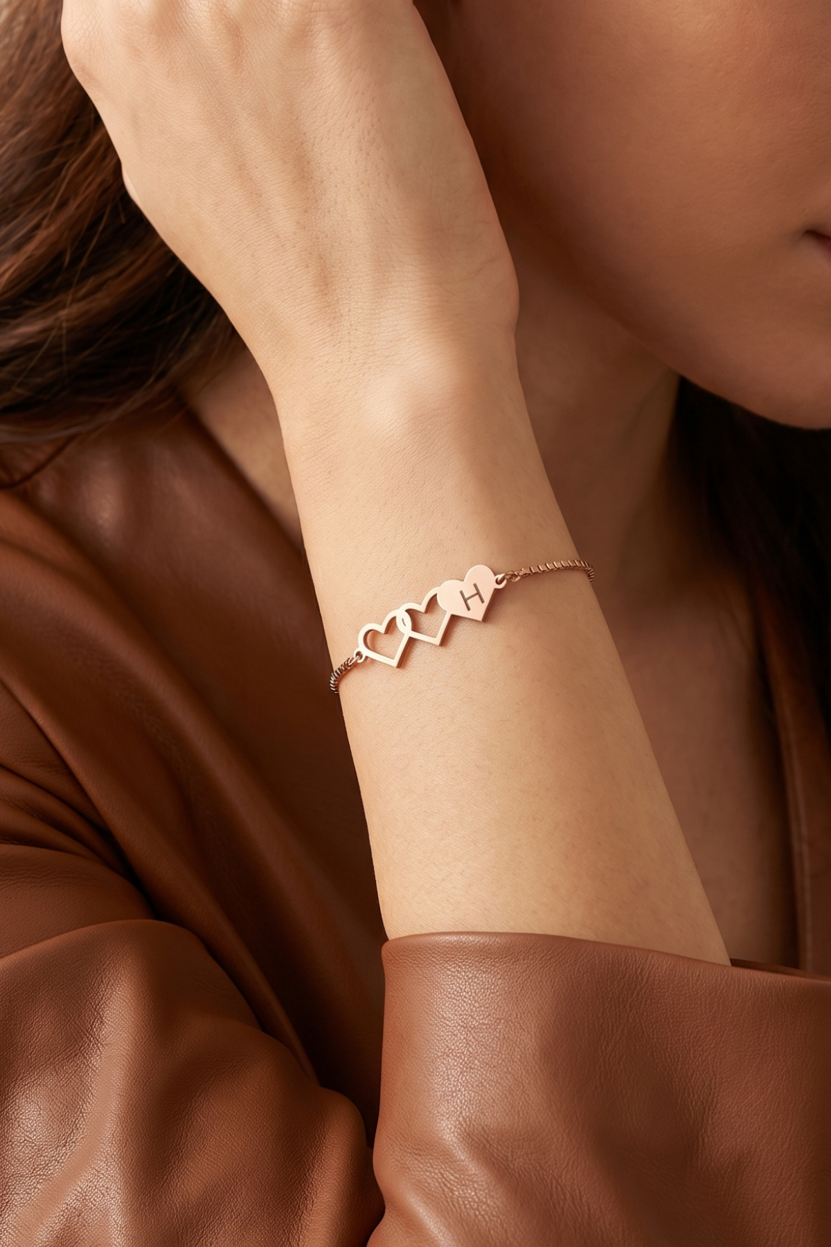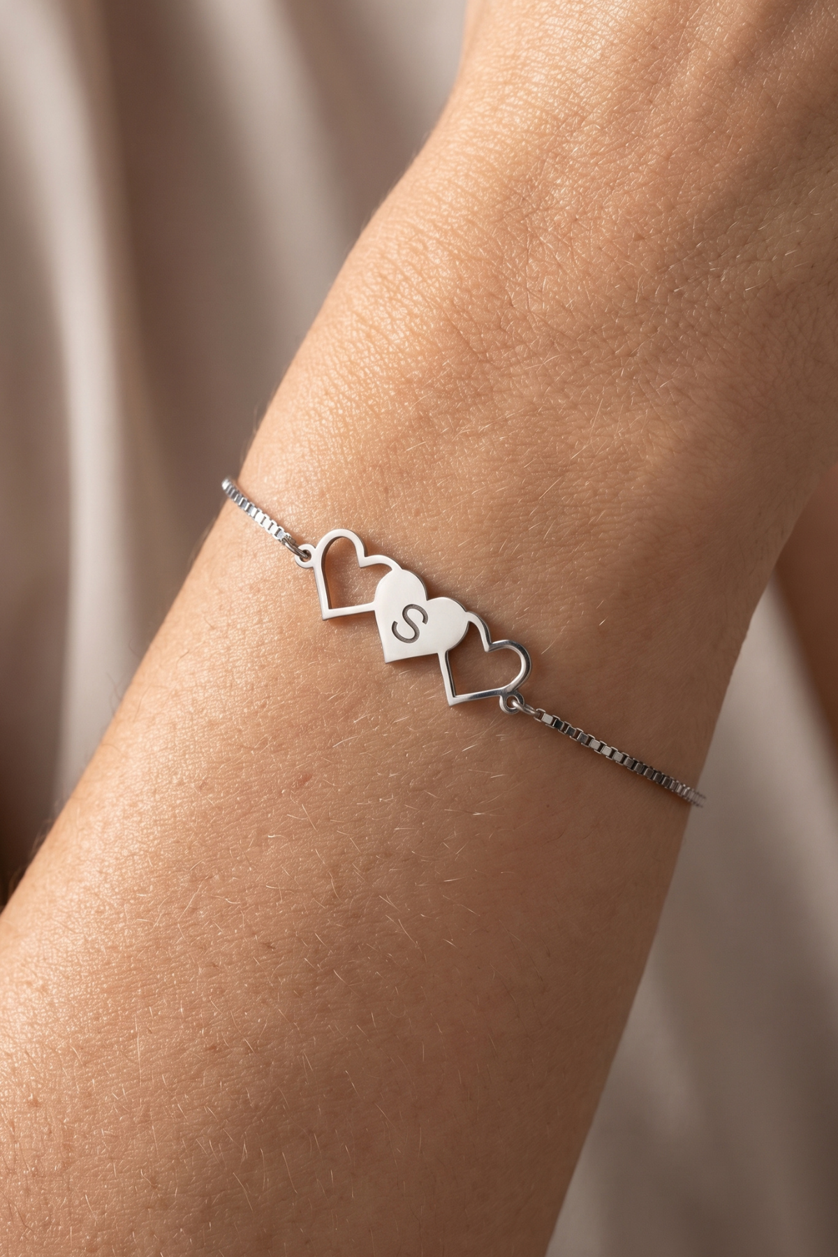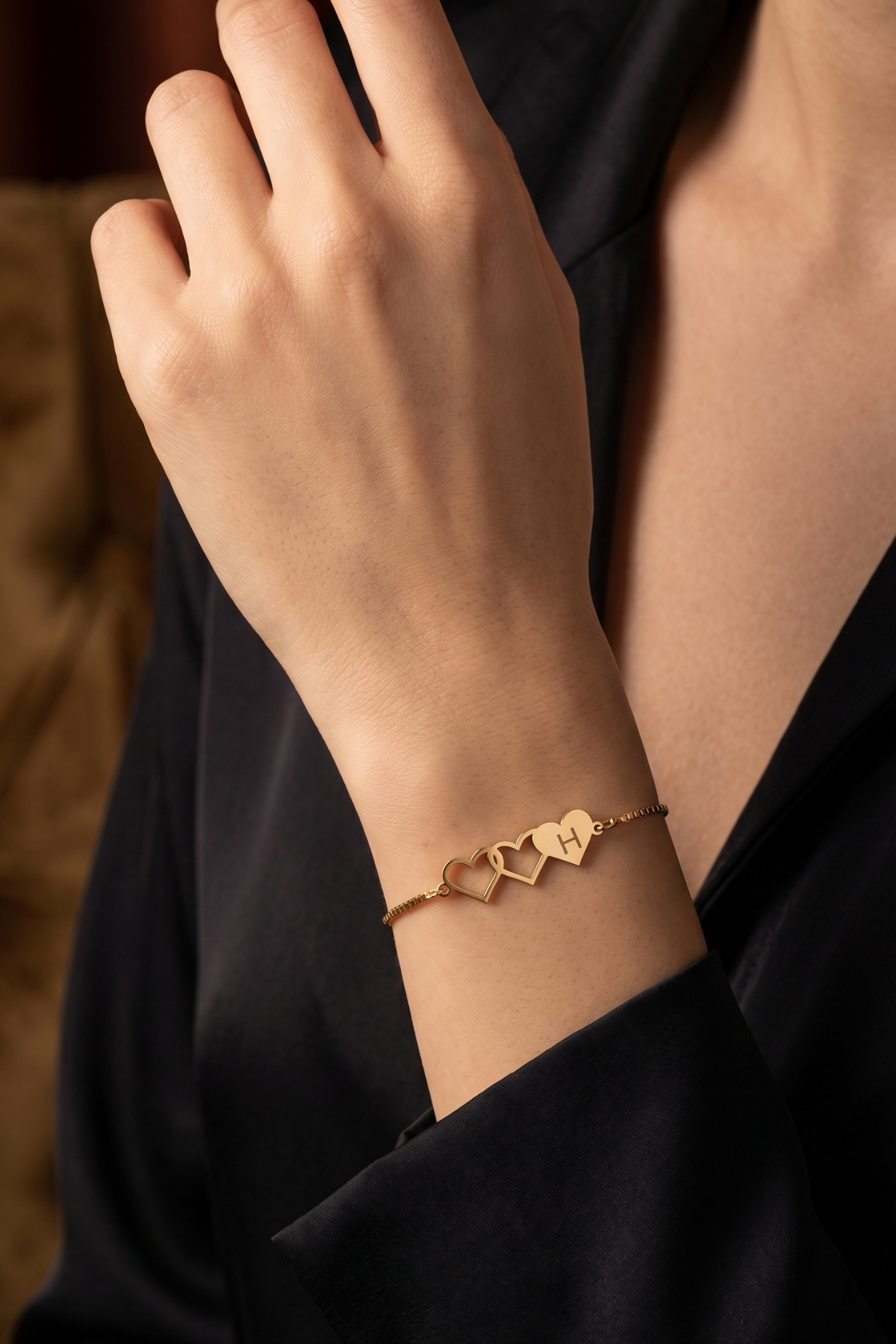Sıkıca birbirine bağlanmış kalpler ve sadece size özel bir harf… Bu zarif birbirine geçmiş kalp bileklik, sadece bir aksesuar olmanın ötesinde; sevginin, ailenin ve sarsılmaz bağların takılabilir bir hikayesidir. İster kendinizi ödüllendirin, ister annenize, kız kardeşinize veya en yakın arkadaşınıza unutulmaz bir hediye verin; bu özel parça onlara kendilerini çok değerli hissettirecek. Her tarza uyum sağlayan minimalist tasarımıyla, sevdiklerinizi her an yanınızda taşımanıza olanak tanır.