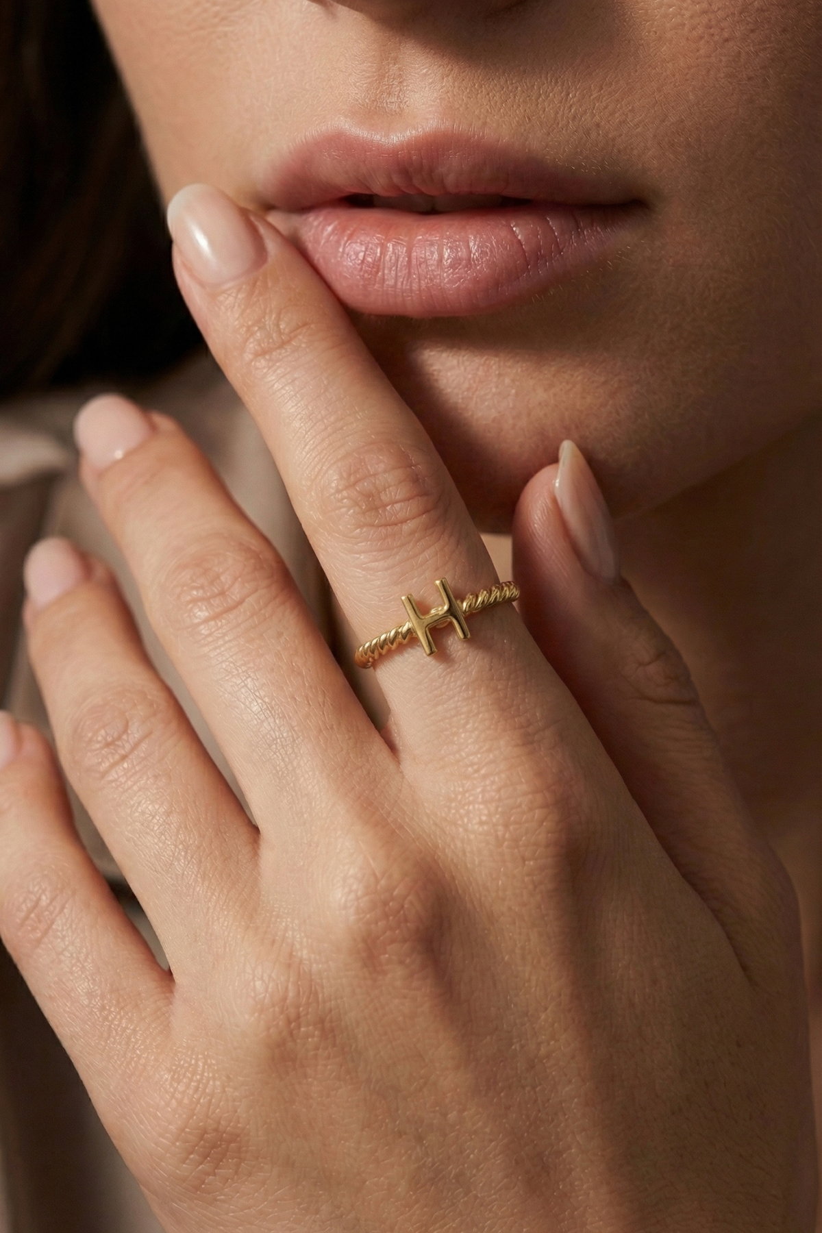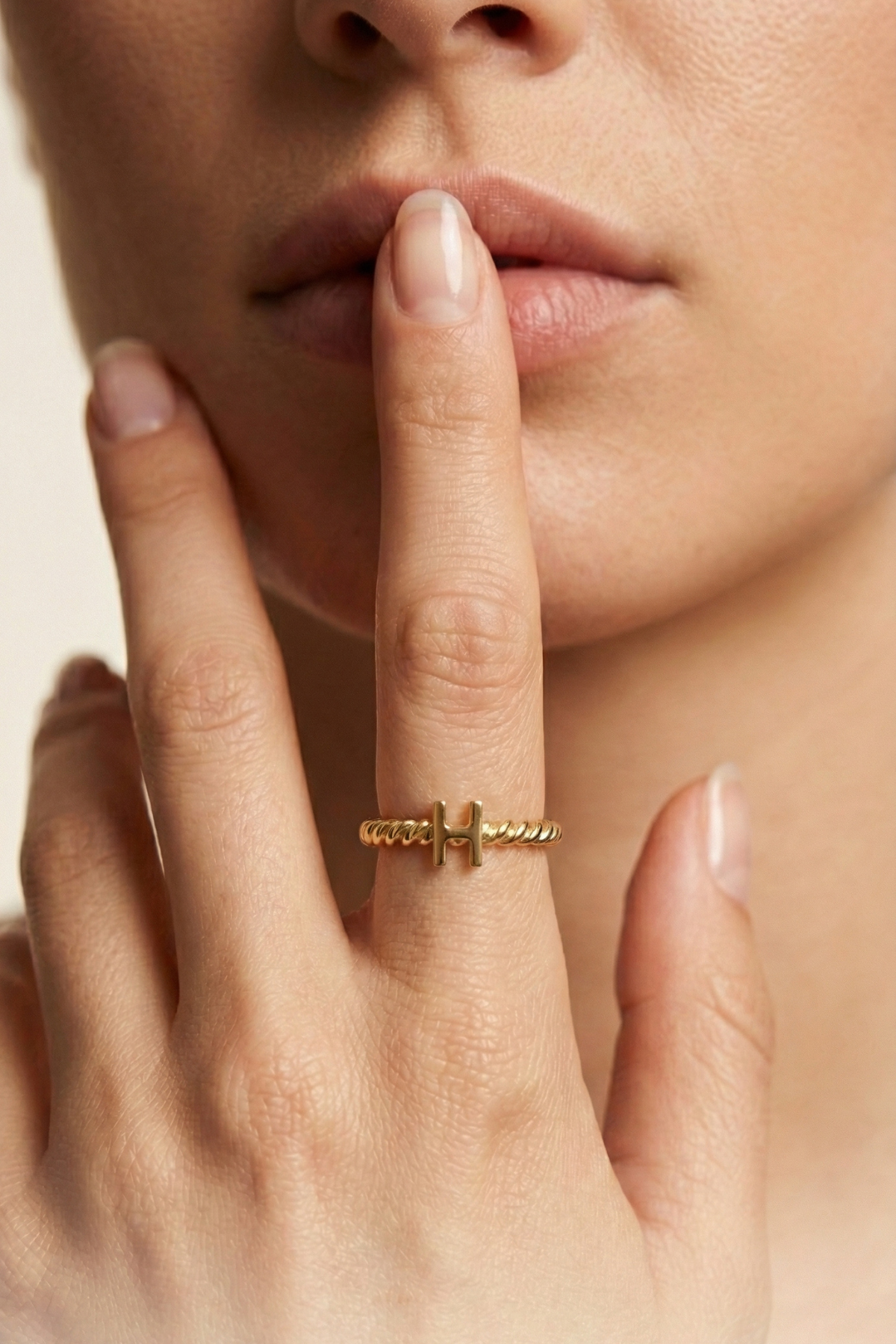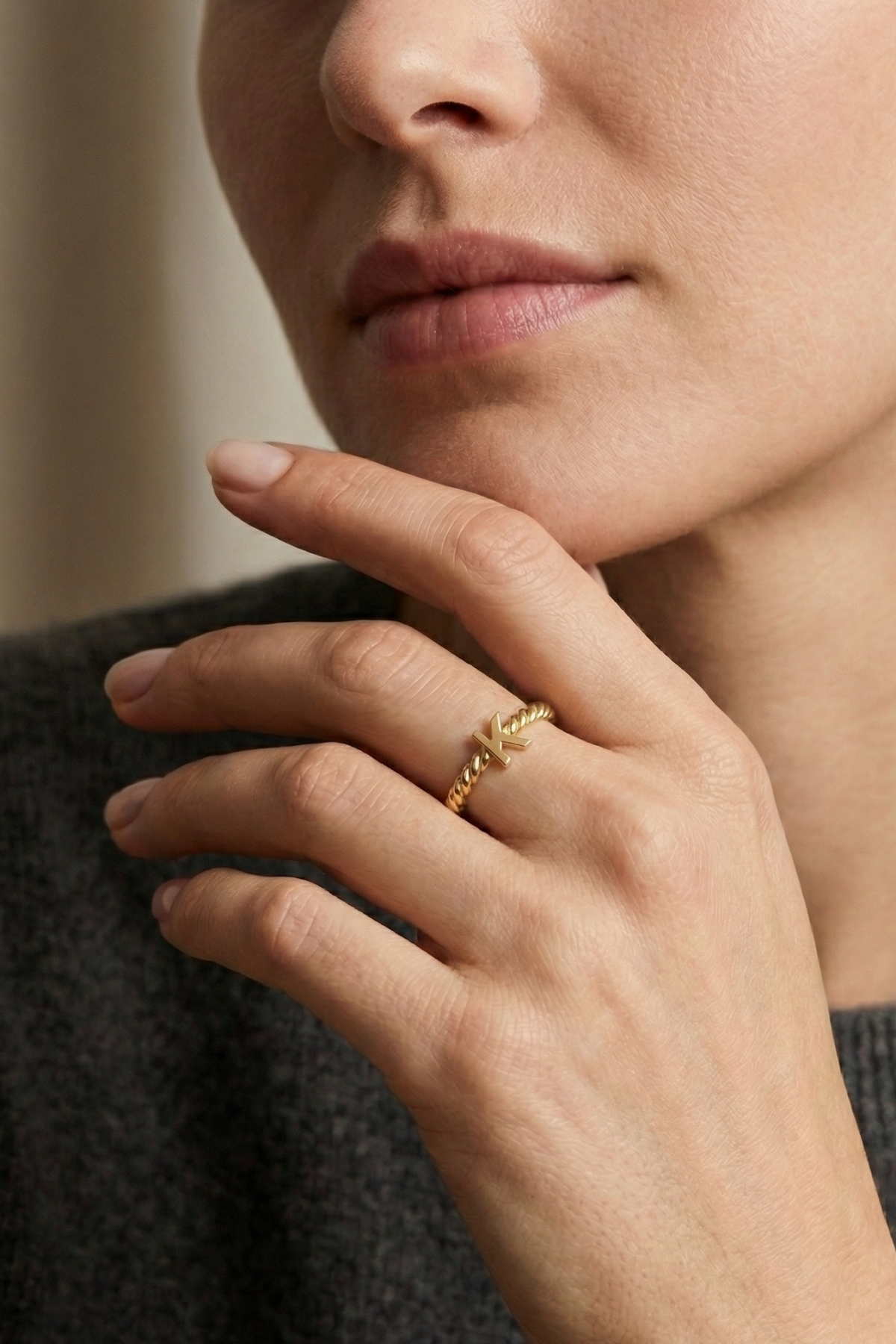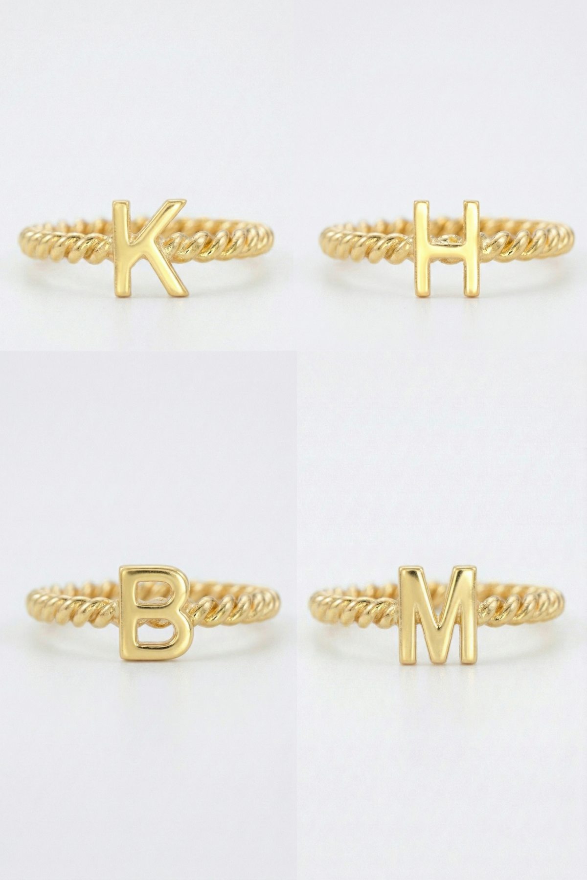 Minimal harf tasarımı modern ve zarif bir stil sunarken, burgu halat formundaki yüzük bandı tasarıma karakter katar. Bu özellik yüzüğü yalnızca bir takı değil aynı zamanda anlamlı bir hatıra haline getirir.