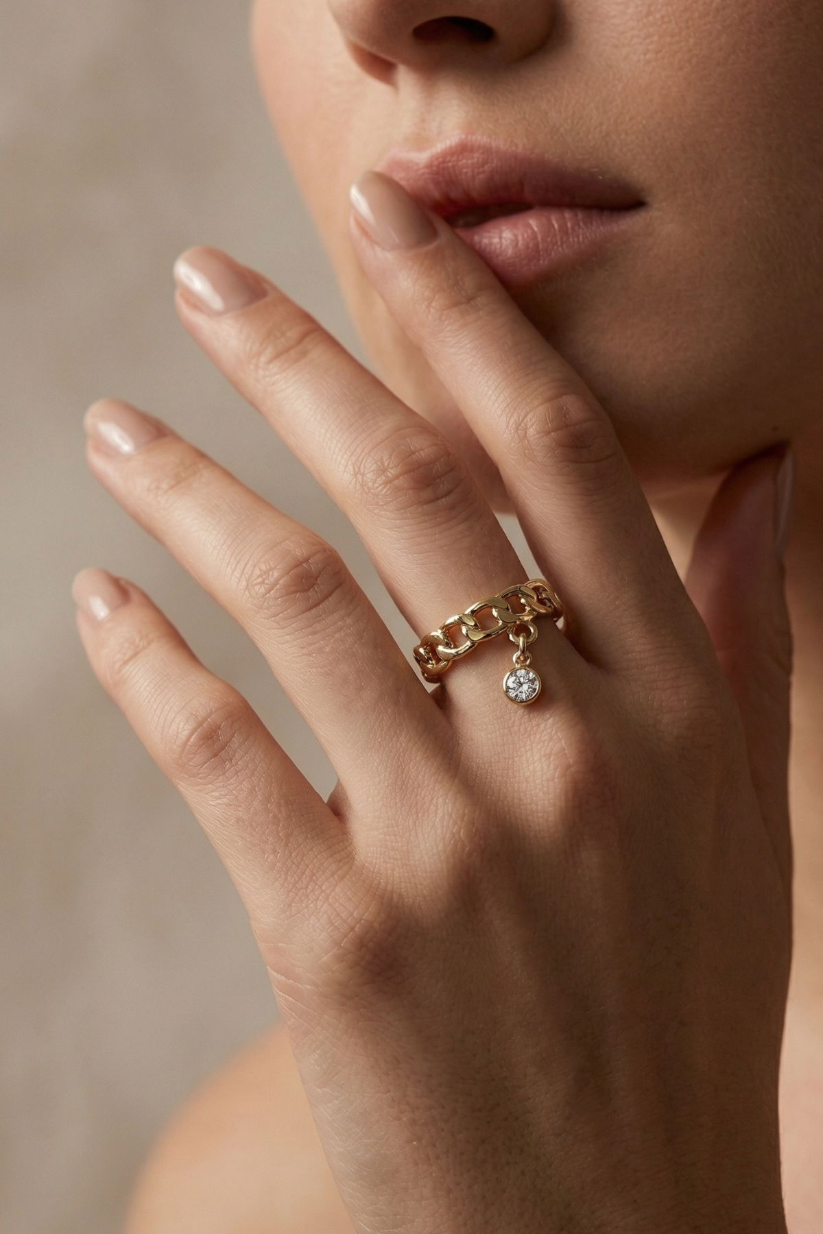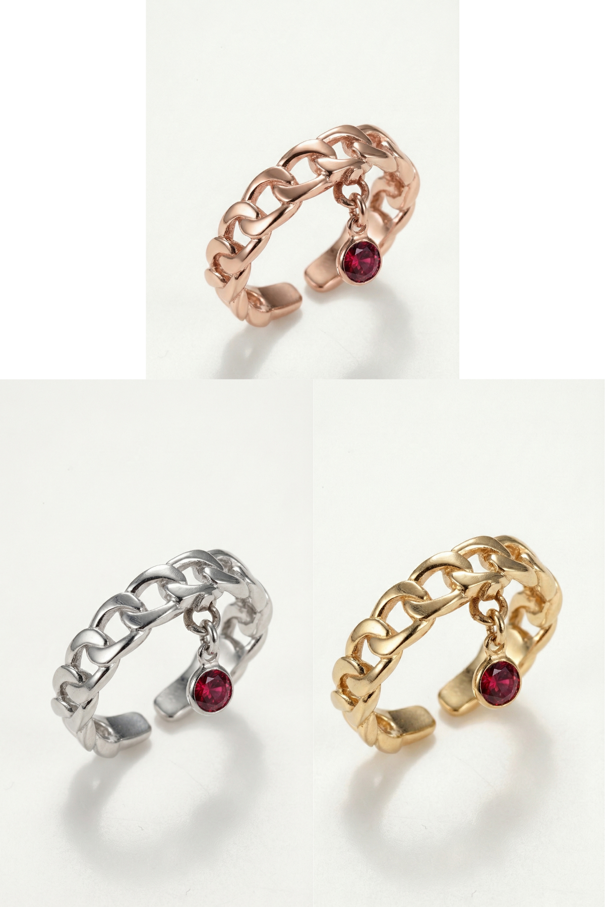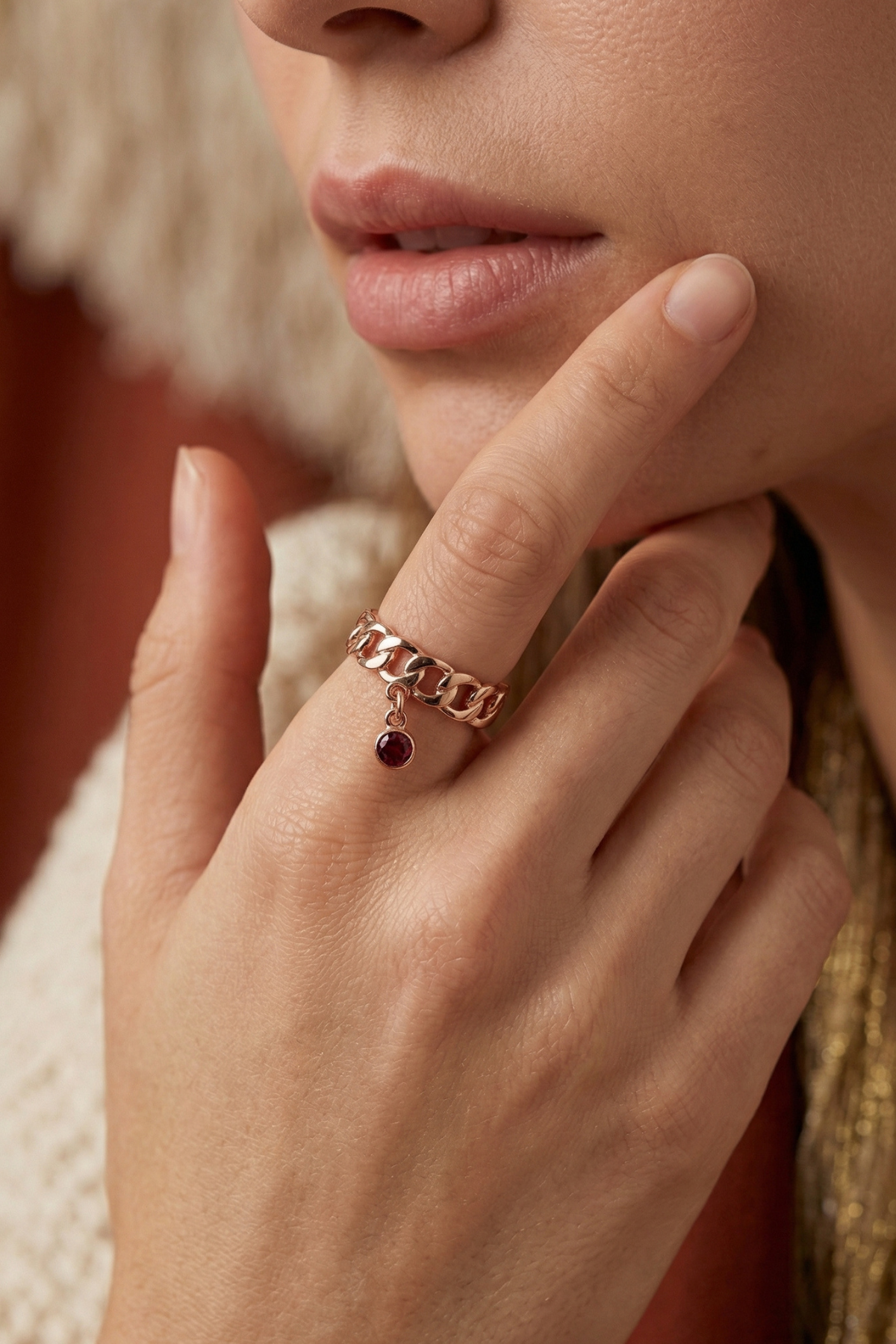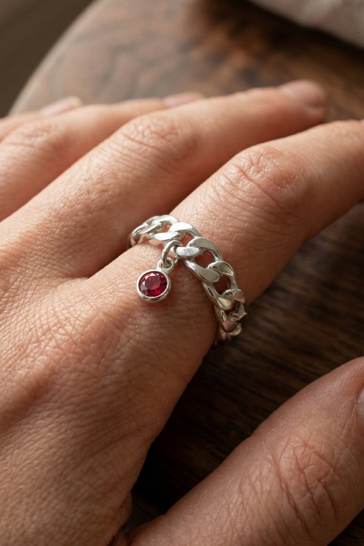 Zincir Charm Doğum Taşı Yüzük, modern zincir bant tasarımını zarif bir doğum taşı charm detayıyla birleştirir. Benzersiz zincir tarzı yüzük çağdaş bir görünüm oluştururken, sallantılı doğum taşı anlamlı ve zarif bir detay katar.
