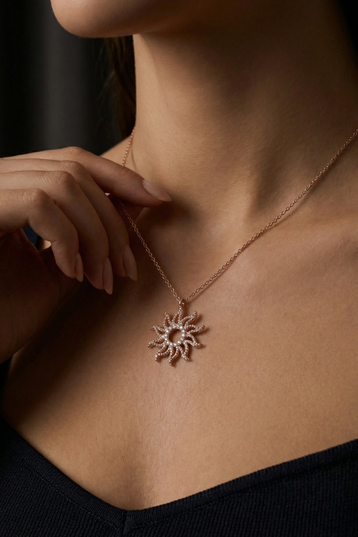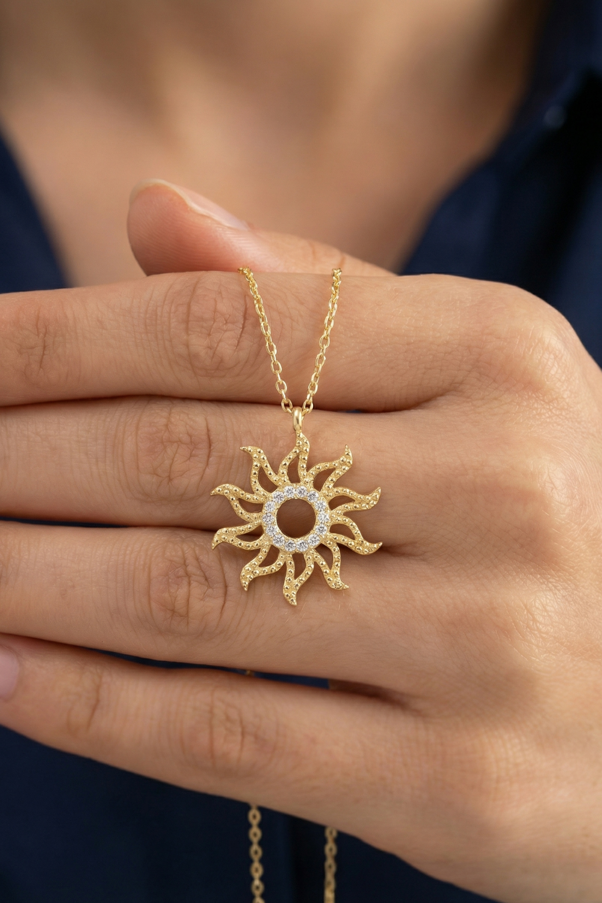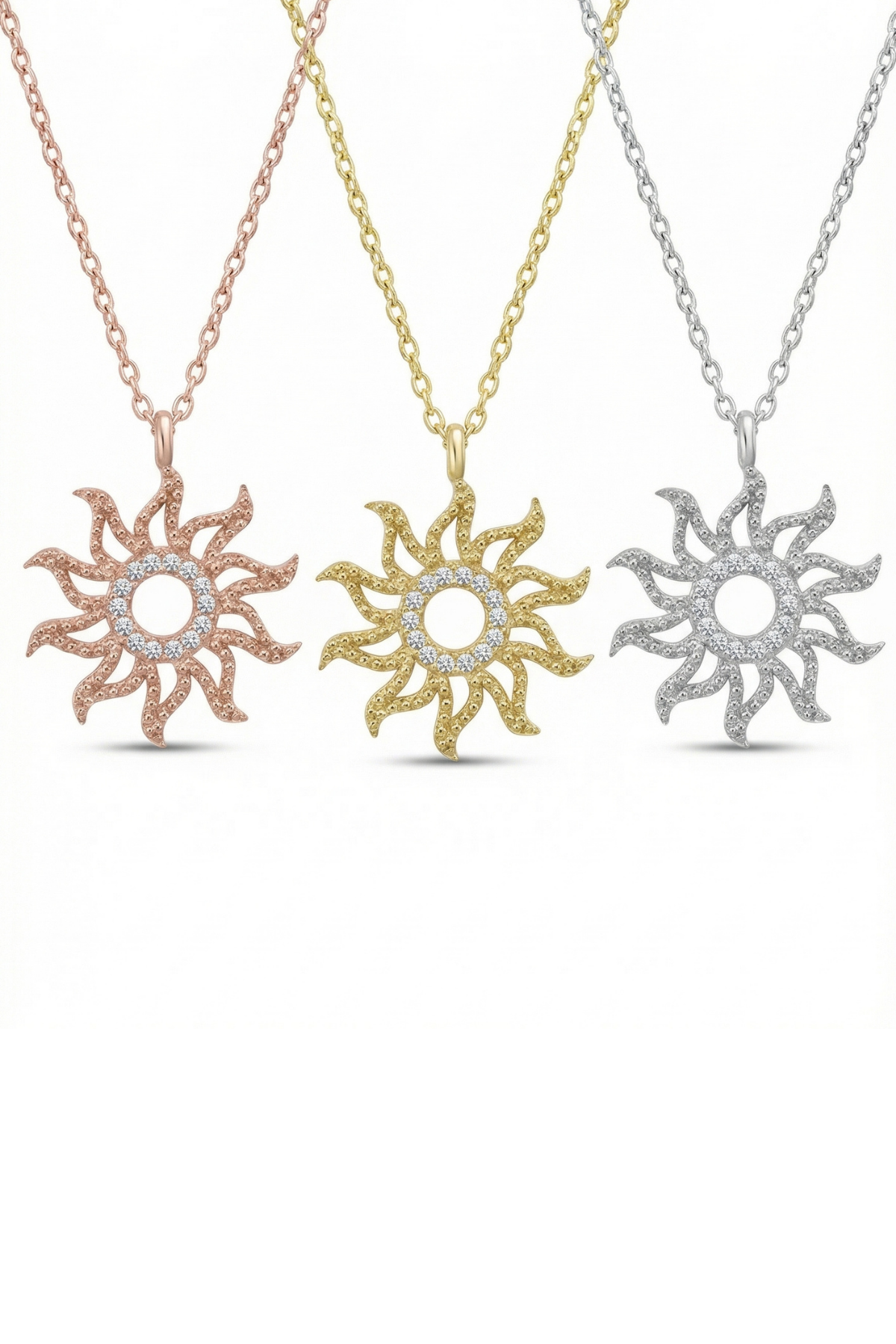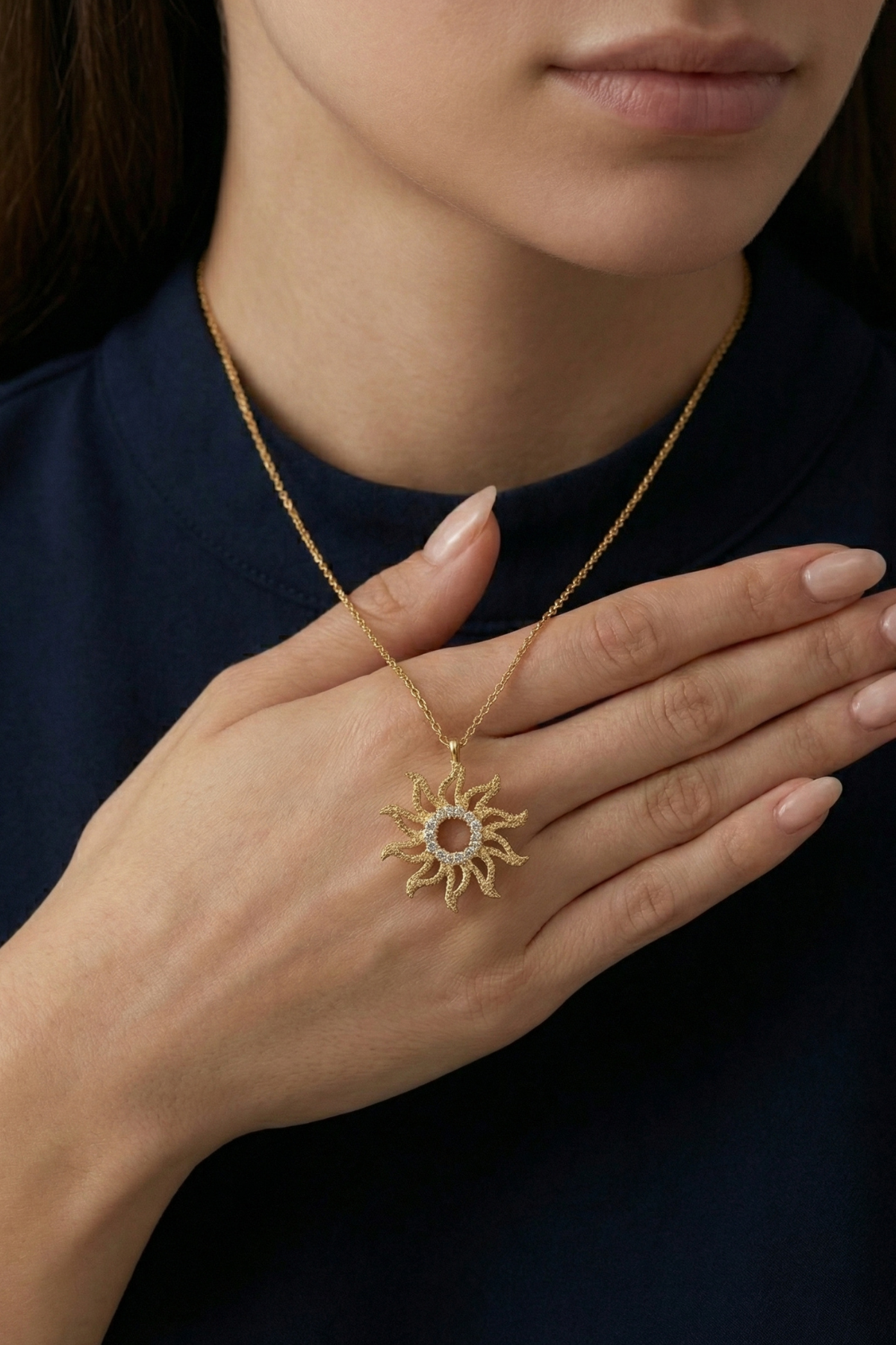 Bu zarif güneş motifli kolye, modern detaylarla birleşen klasik bir form sunarak stiline ışıltılı bir dokunuş katmak için tasarlandı.