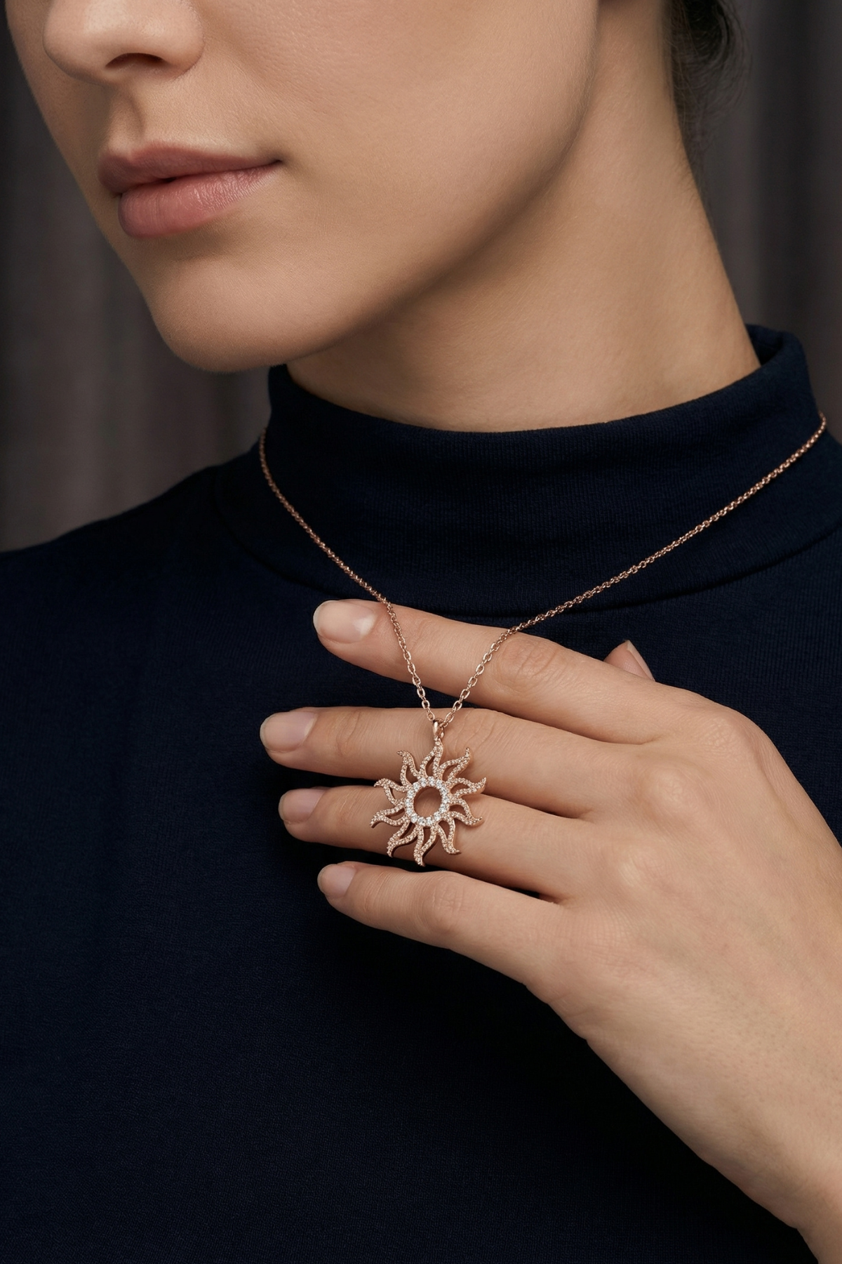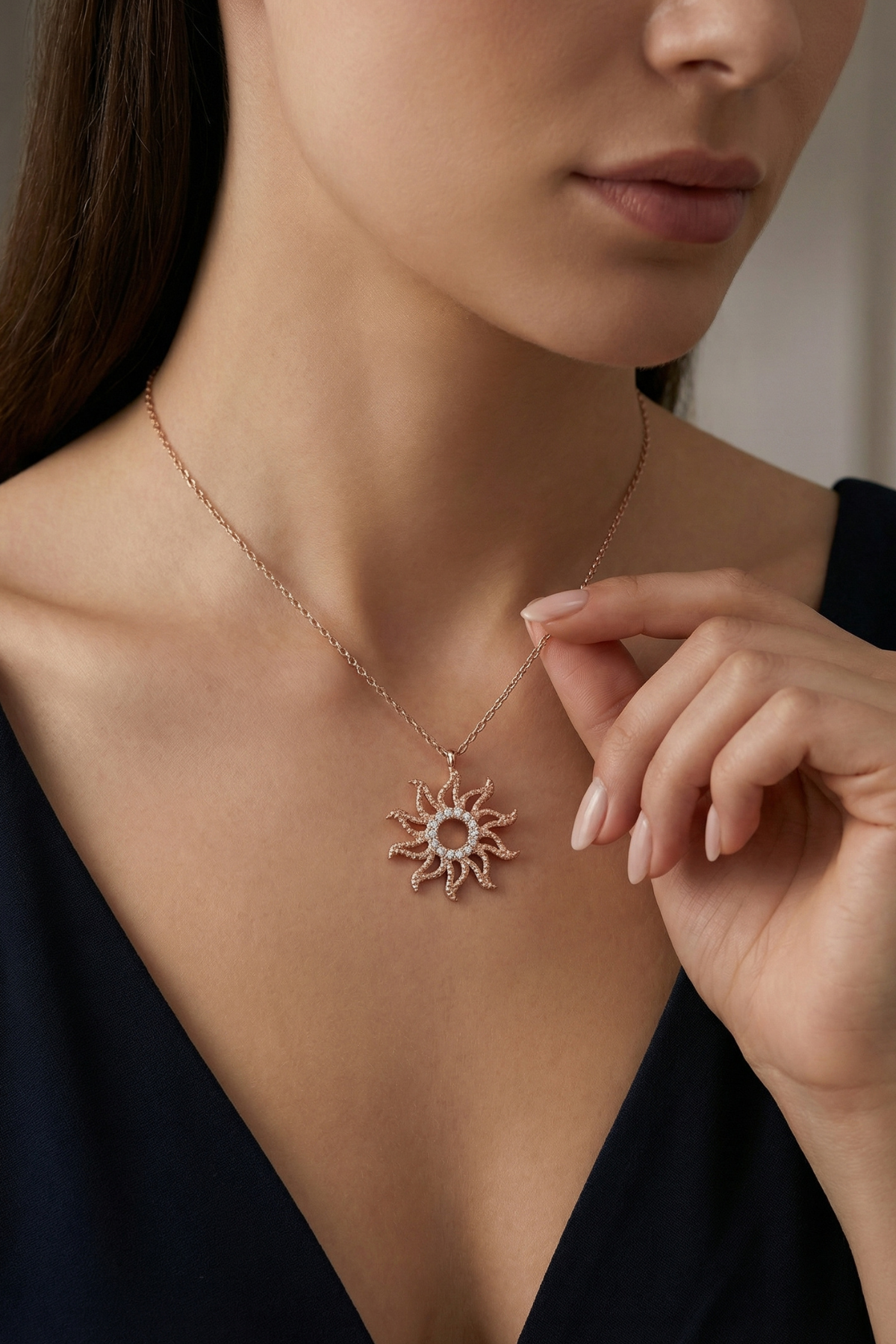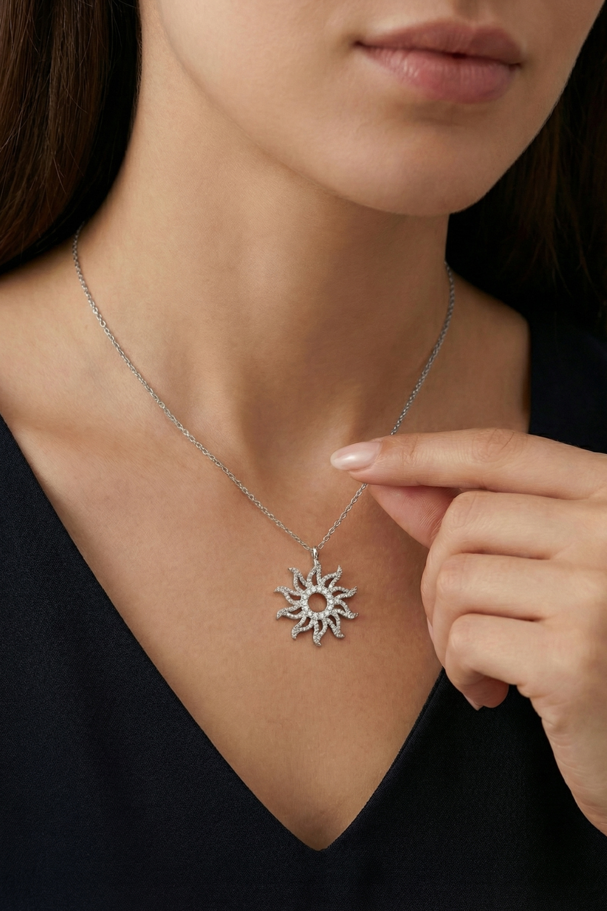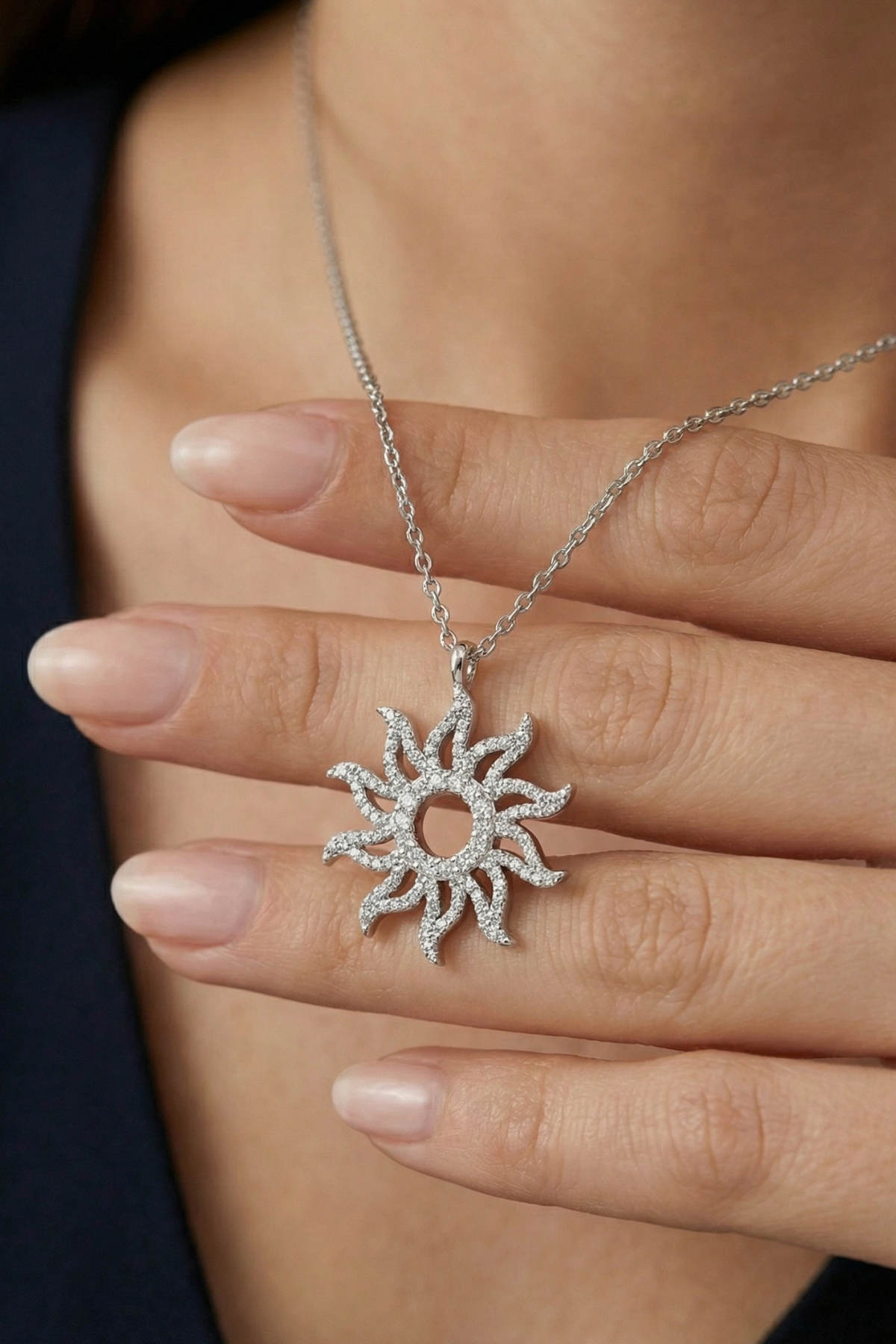 Bu zarif güneş motifli kolye, modern detaylarla birleşen klasik bir form sunarak stiline ışıltılı bir dokunuş katmak için tasarlandı.