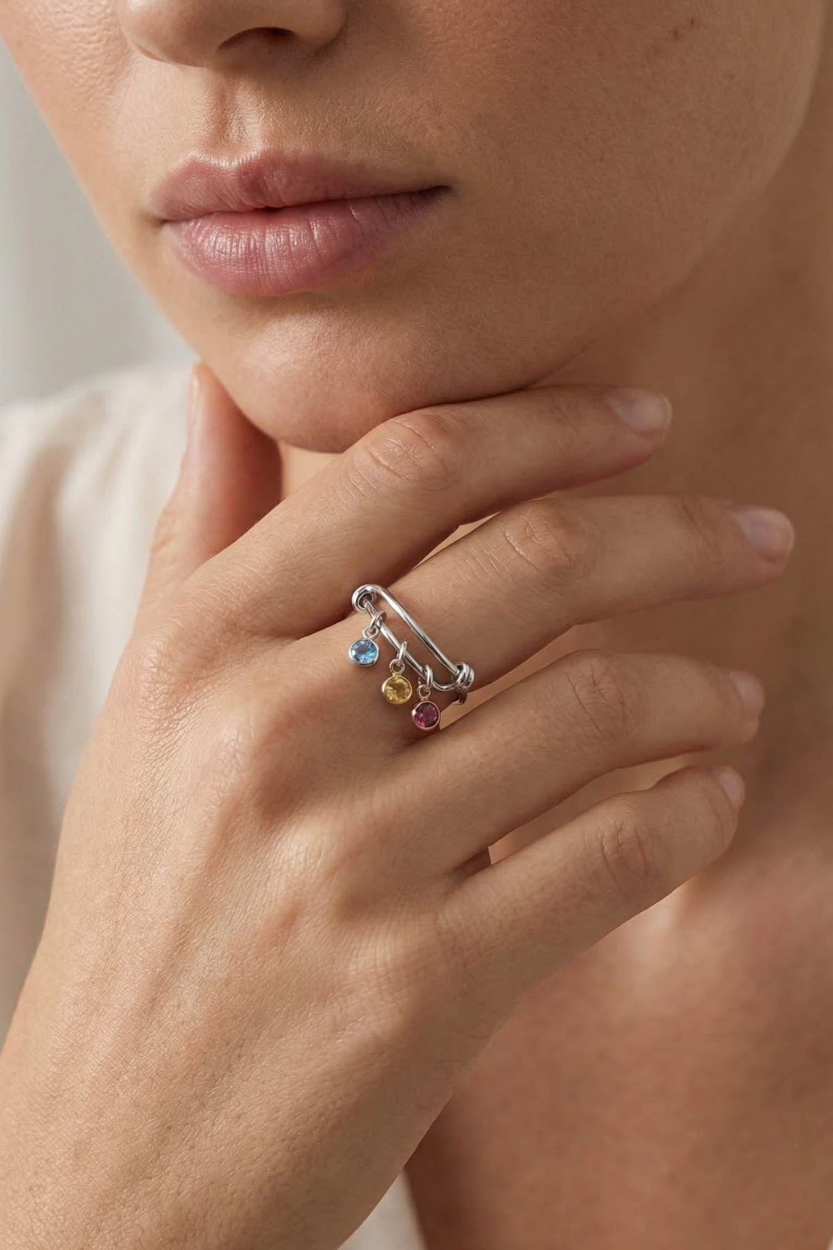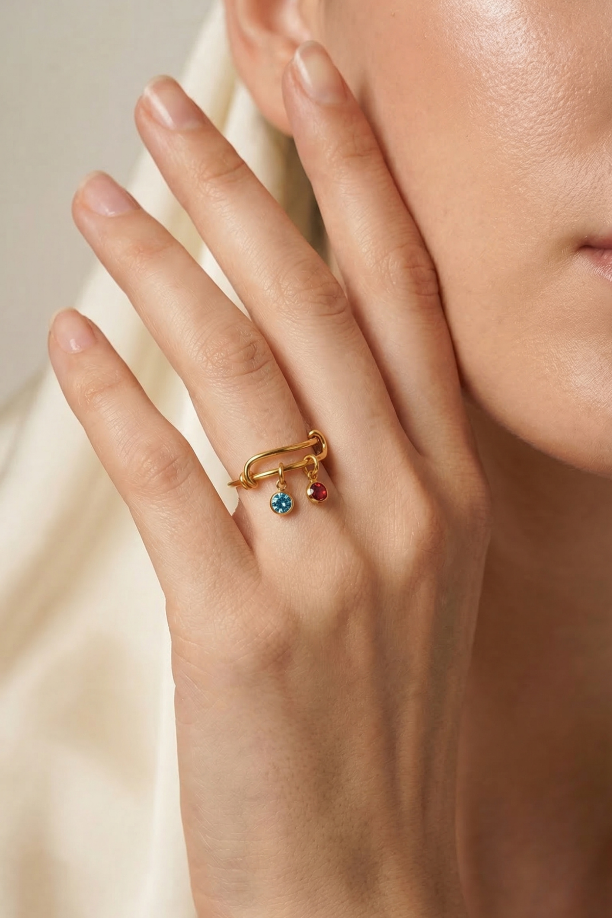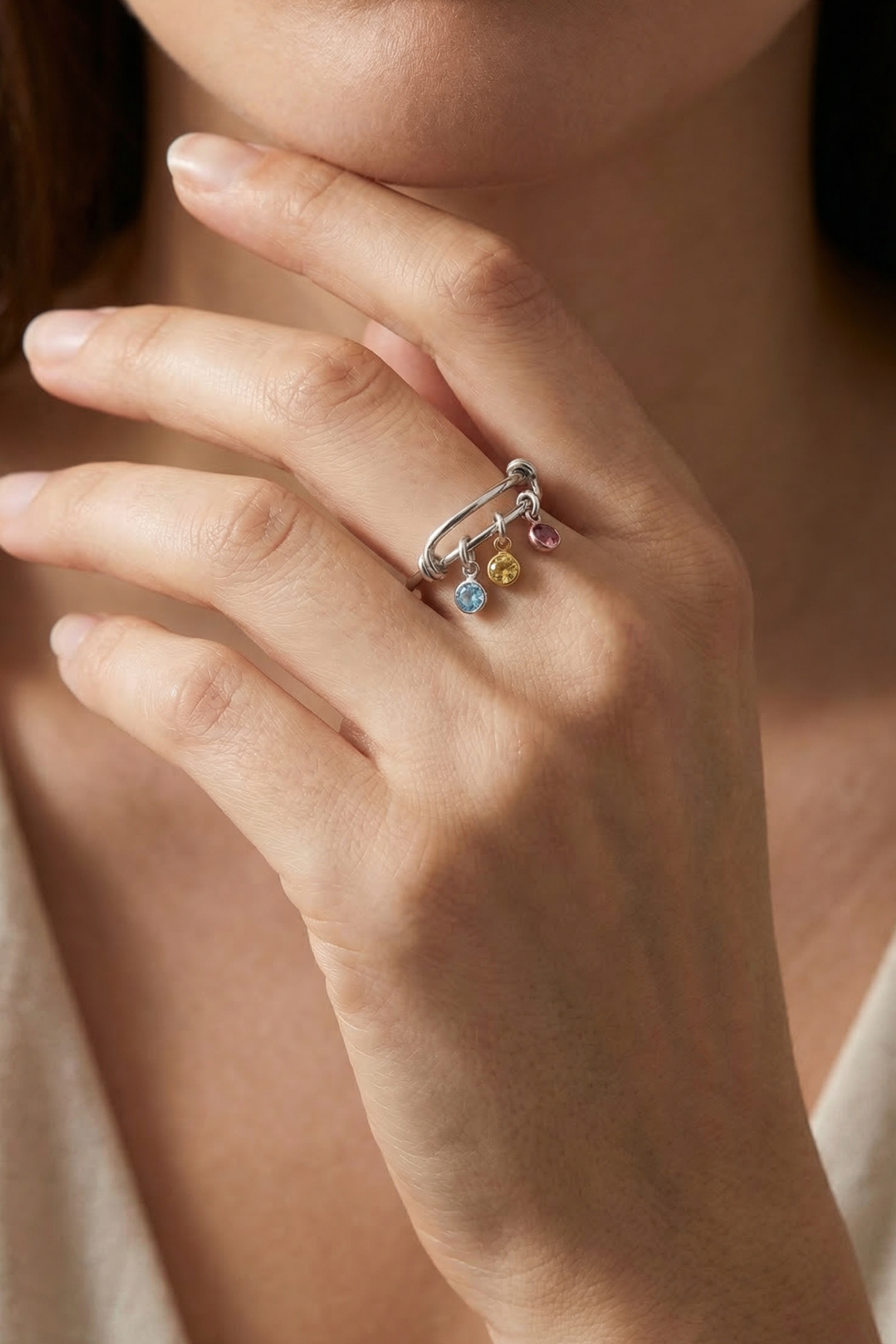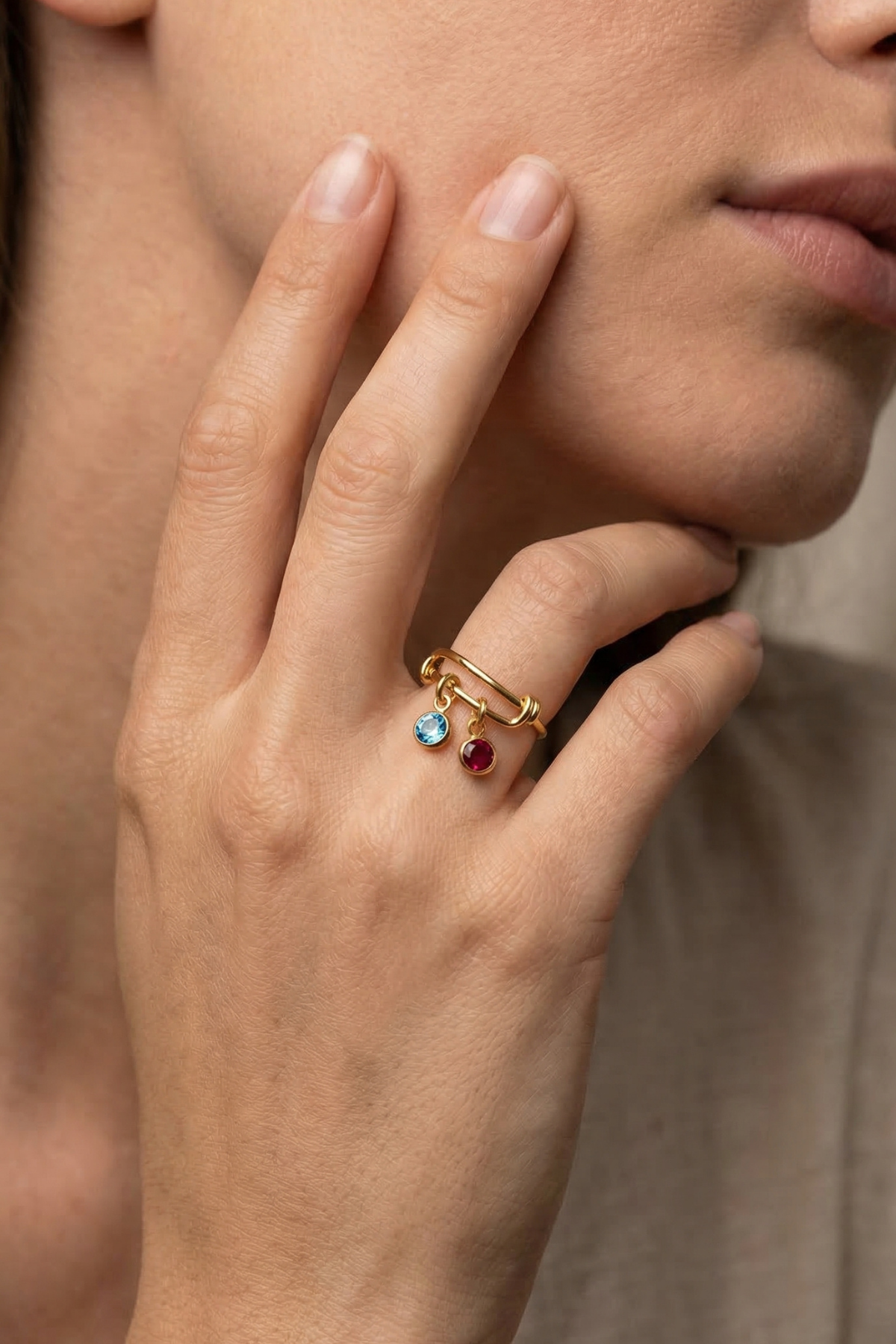 Birden fazla sallantılı doğum taşı detayı ile tasarlanan bu zarif yüzük, hareketli yapısı sayesinde her harekette dikkat çeken şık bir görünüm sunar. Minimal tasarımı kişisel anlamlarla birleştirerek günlük kullanıma uygun özel bir stil oluşturur.