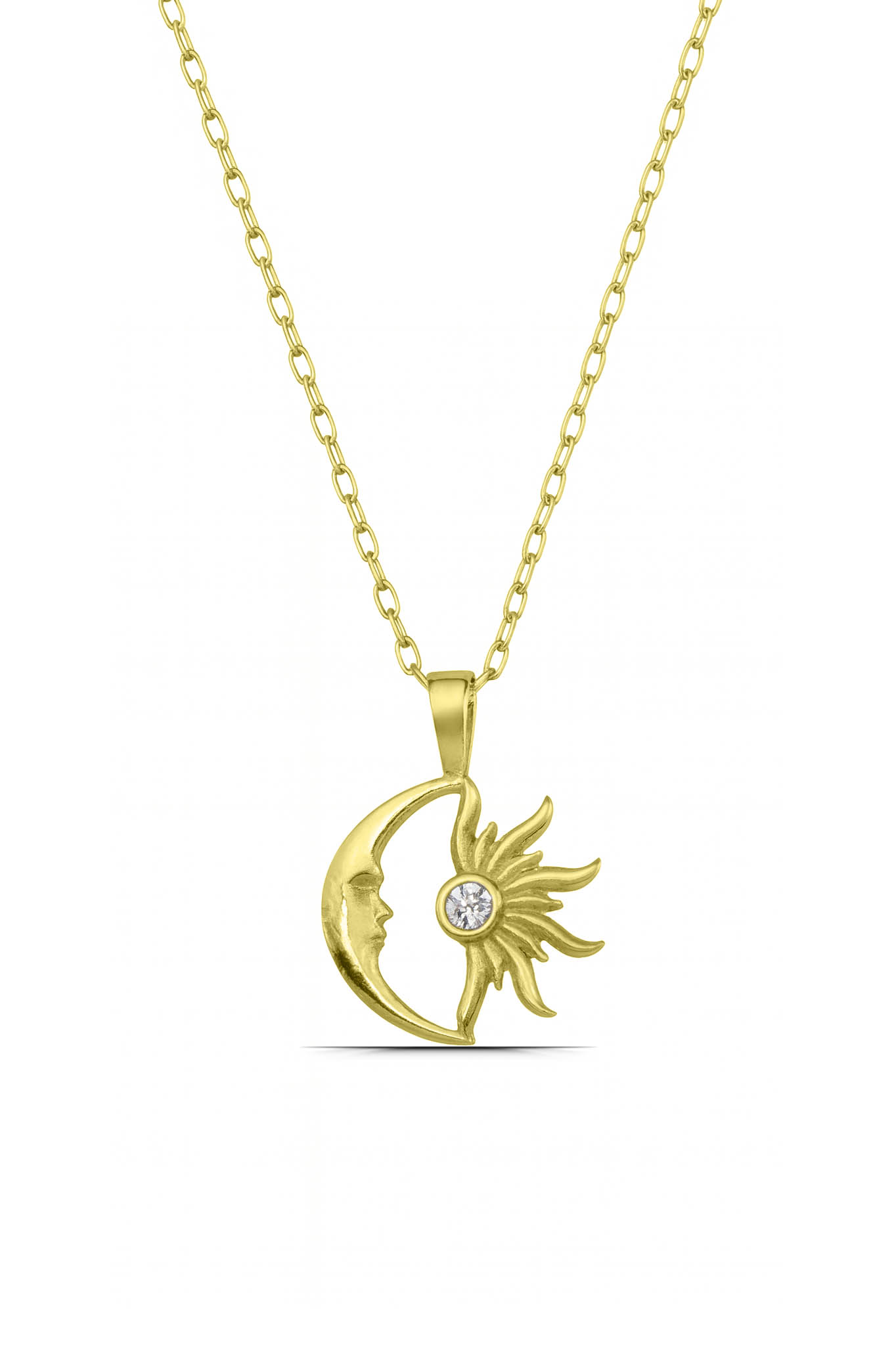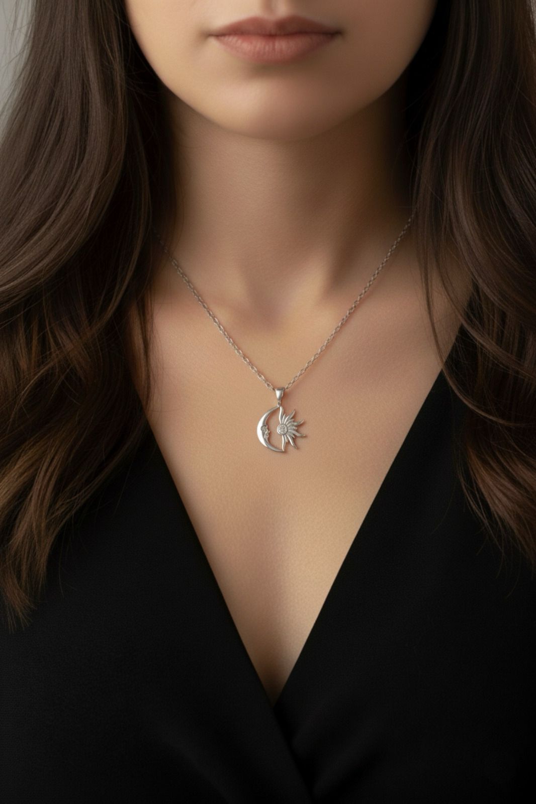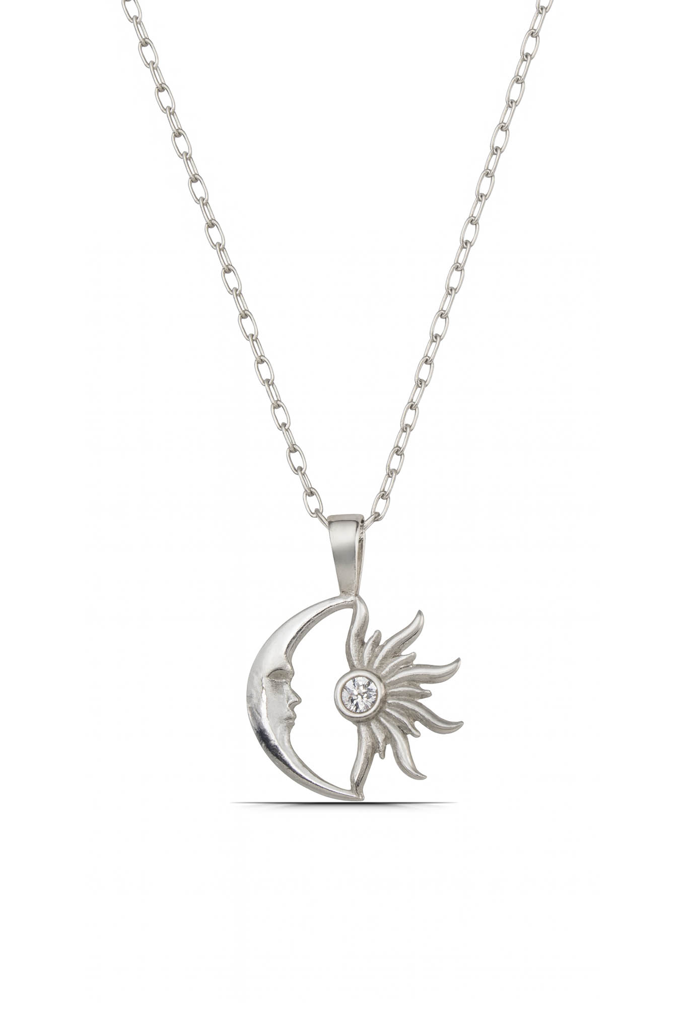 Güneşin enerjisini ve hilalin zarafetini bir araya getiren bu özel tasarım kolye, 925 ayar gümüşün parlaklığı ile tarzınıza anlam katar.