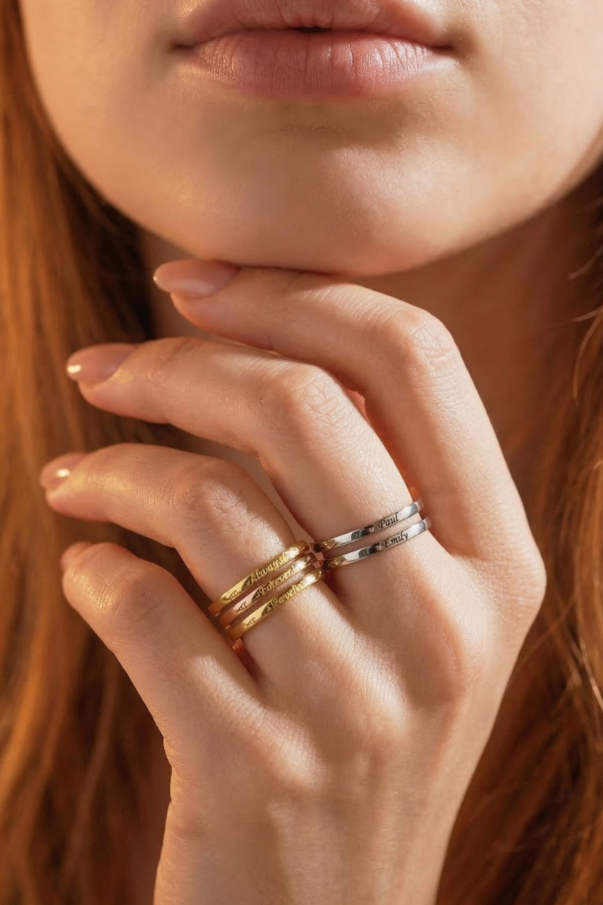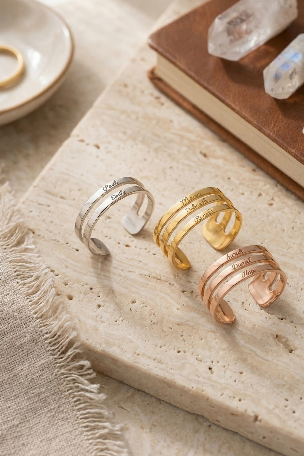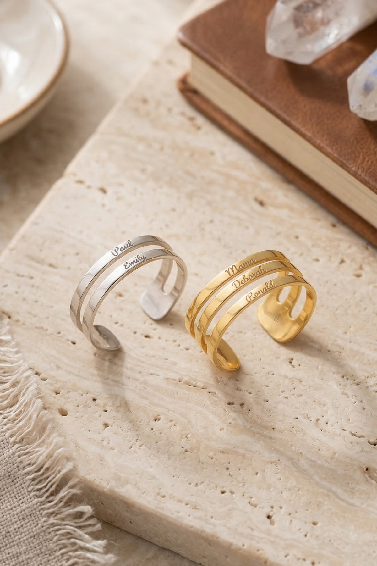 Bu özel tasarım yüzük, hayatınızdaki en değerli isimleri her an yanınızda taşımanız için tasarlandı. İster sevdiklerinizin isimleri, ister sizin için anlamı olan kelimeler… Her biri bu yüzüğü benzersiz hale getirir.
