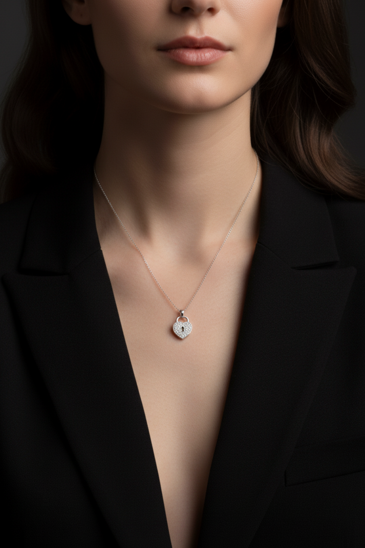 Kalp ve Anahtar Tasarım 925 Ayar Gümüş Kadın Kolye, zarafeti ve anlamı bir arada taşımak isteyenler için özel olarak tasarlandı. Kalp formundaki kilit detayının üzerinde yer alan parlak zirkon taşlar, ışığı her açıdan yakalayarak kusursuz bir ışıltı sunar.