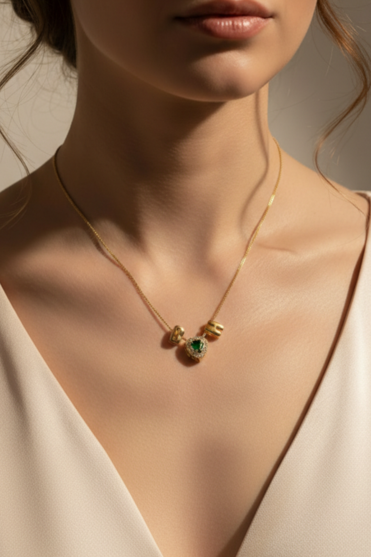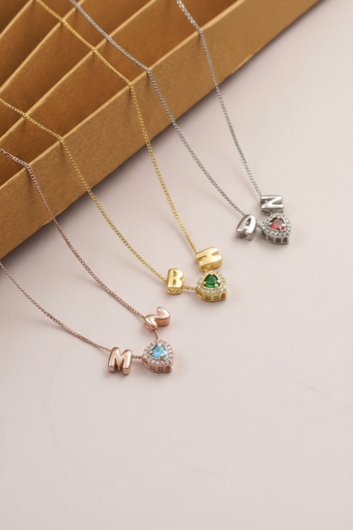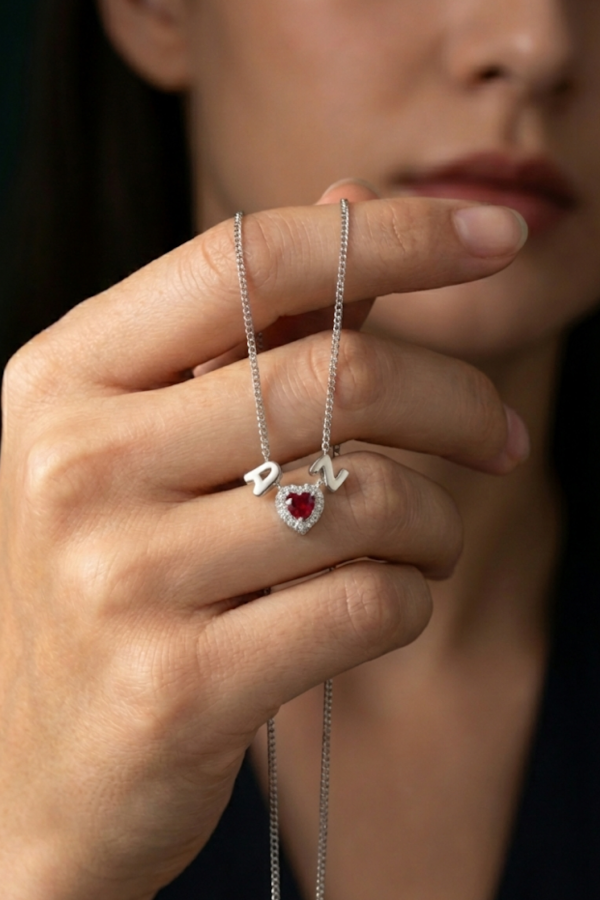 Kalp şeklindeki taş charm detayı ile harf kolye ucunun birleşimi, anlamlı ve rafine bir tasarım oluşturur.