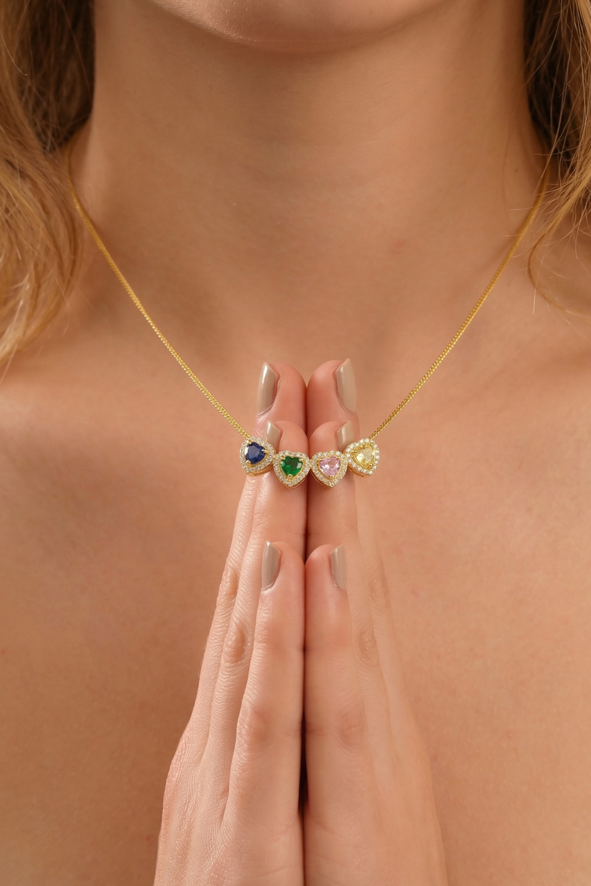 Zarif kalp formu ve renkli taş detaylarıyla tasarlanan bu özel kolye, kişisel anlam taşıyan modern bir takı deneyimi sunar. Her bir kalp detayı, seçtiğiniz taş rengiyle size veya sevdiklerinize özel hale gelir.