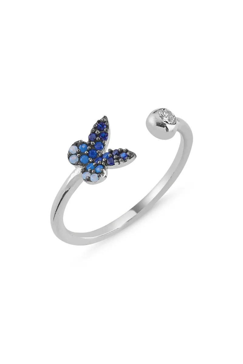 Kelebek Mavi Zirkon Taşlı 925 Ayar Gümüş Ayarlanabilir Yüzük