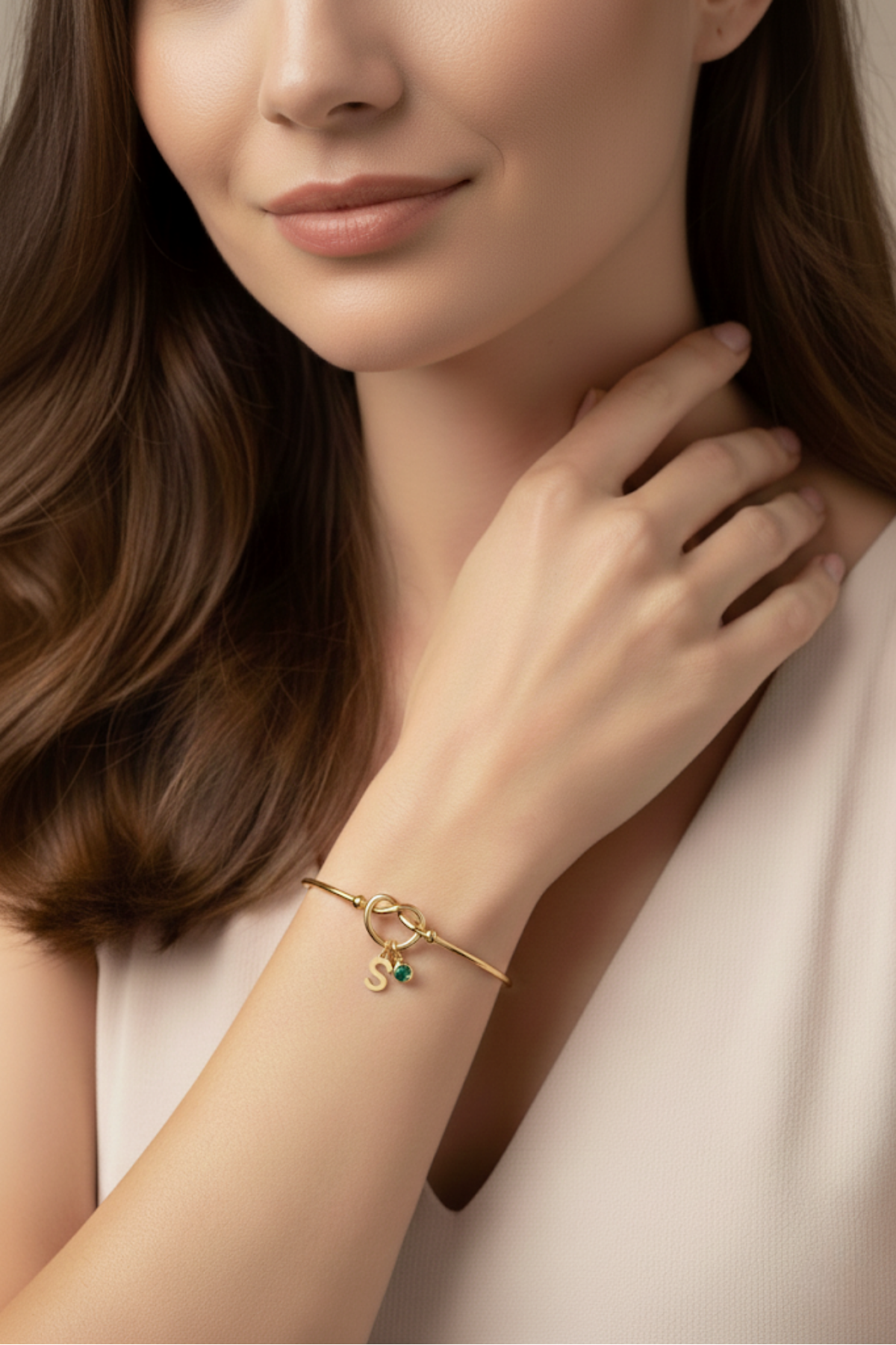Minimal “harf” tasarımı, seçilen baş harfi zarif bir şekilde ön plana çıkarırken; zirkon taş detayı ışığı yumuşak bir parlaklıkla yansıtarak bilekliğe sofistike bir dokunuş ekler. İnce ve açık uçlu bileklik yapısı sayesinde bileğe kolayca uyum sağlar ve konforlu bir kullanım sunar.