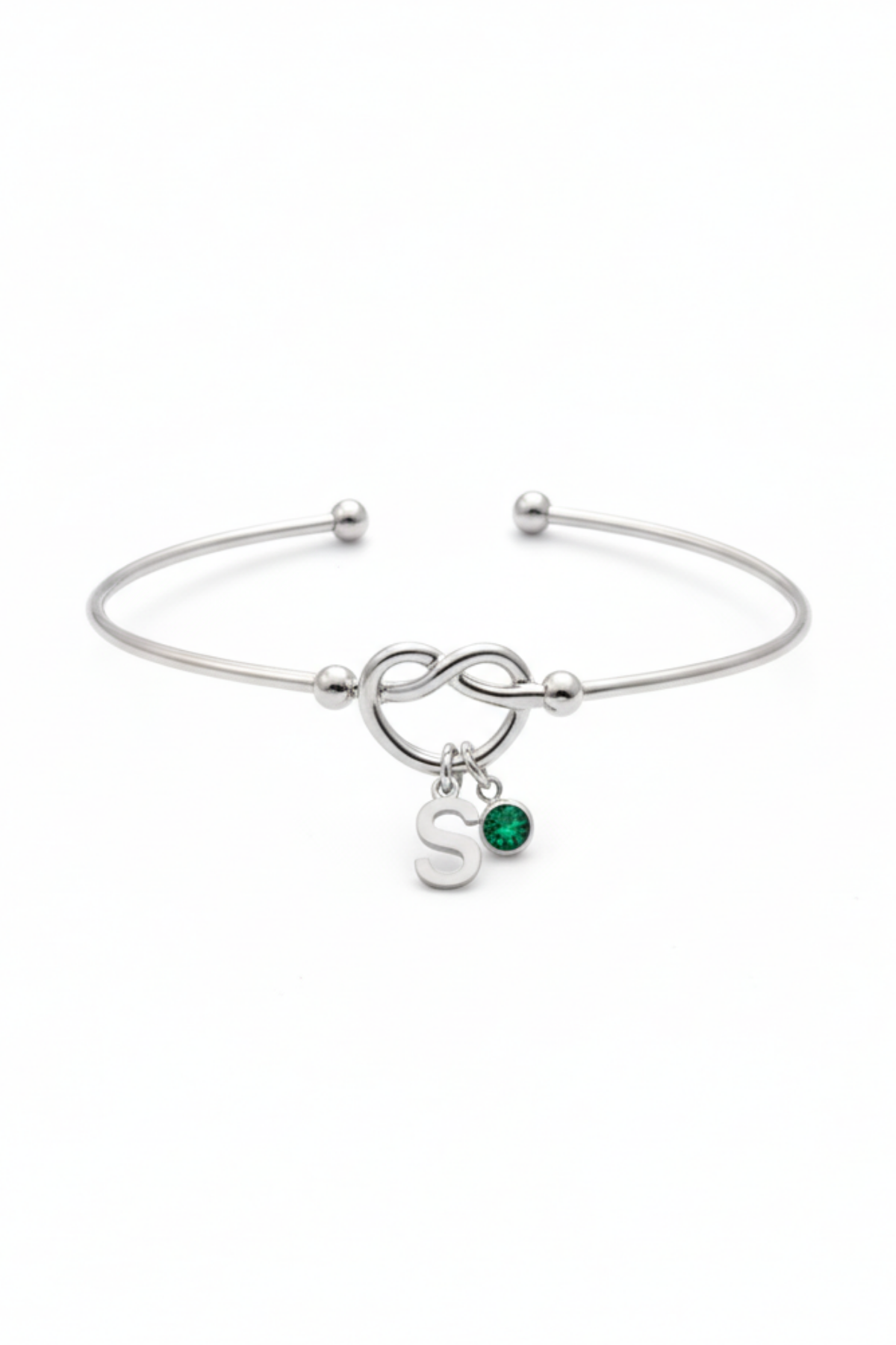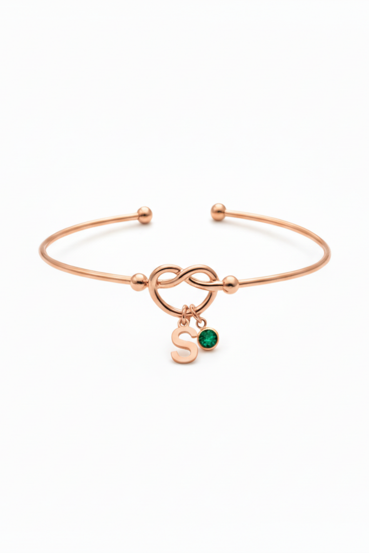 Kişiye Özel Harfli 925 Ayar Gümüş Kadın Bileklik, modern ve sade çizgileriyle günlük şıklığı tamamlayan; anlam yüklü detaylarıyla duygusal bir bağ kuran özel bir tasarımdır. İnce bileklik formu, ortasında yer alan zarif düğüm detayıyla bilekte estetik bir denge oluştururken; sallantılı harf ve parlak taş detayı bilekliğe hareket ve karakter kazandırır.
