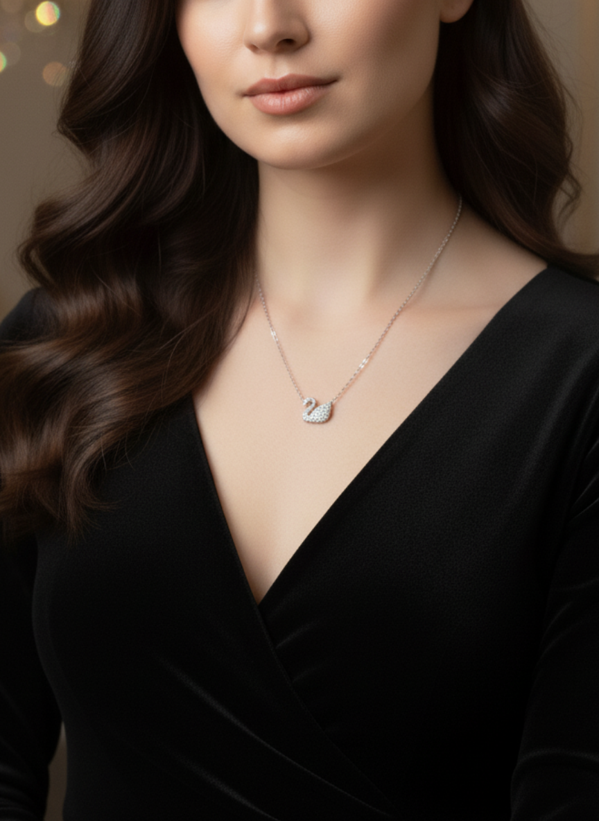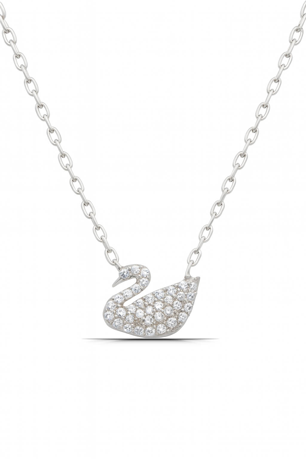 Parlak zirkon taşlarla işlenmiş kuğu figürü, saflık, huzur ve sevgi sembolü olarak boynunuzda zarif bir dokunuş bırakır.