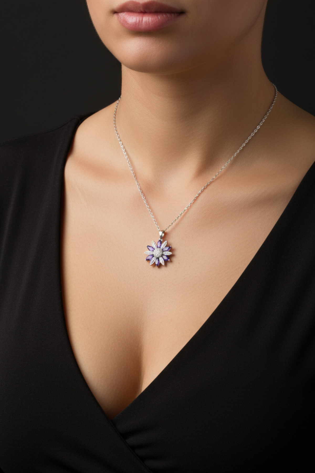 Bu kolye, mor ametist taşlarının büyüleyici enerjisiyle birleşerek hem zarafeti hem de dinginliği temsil eder.