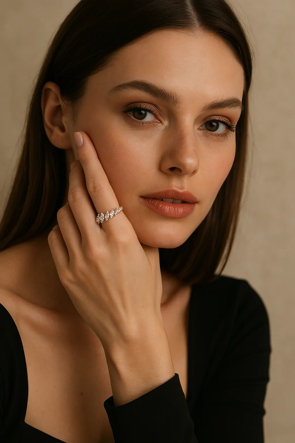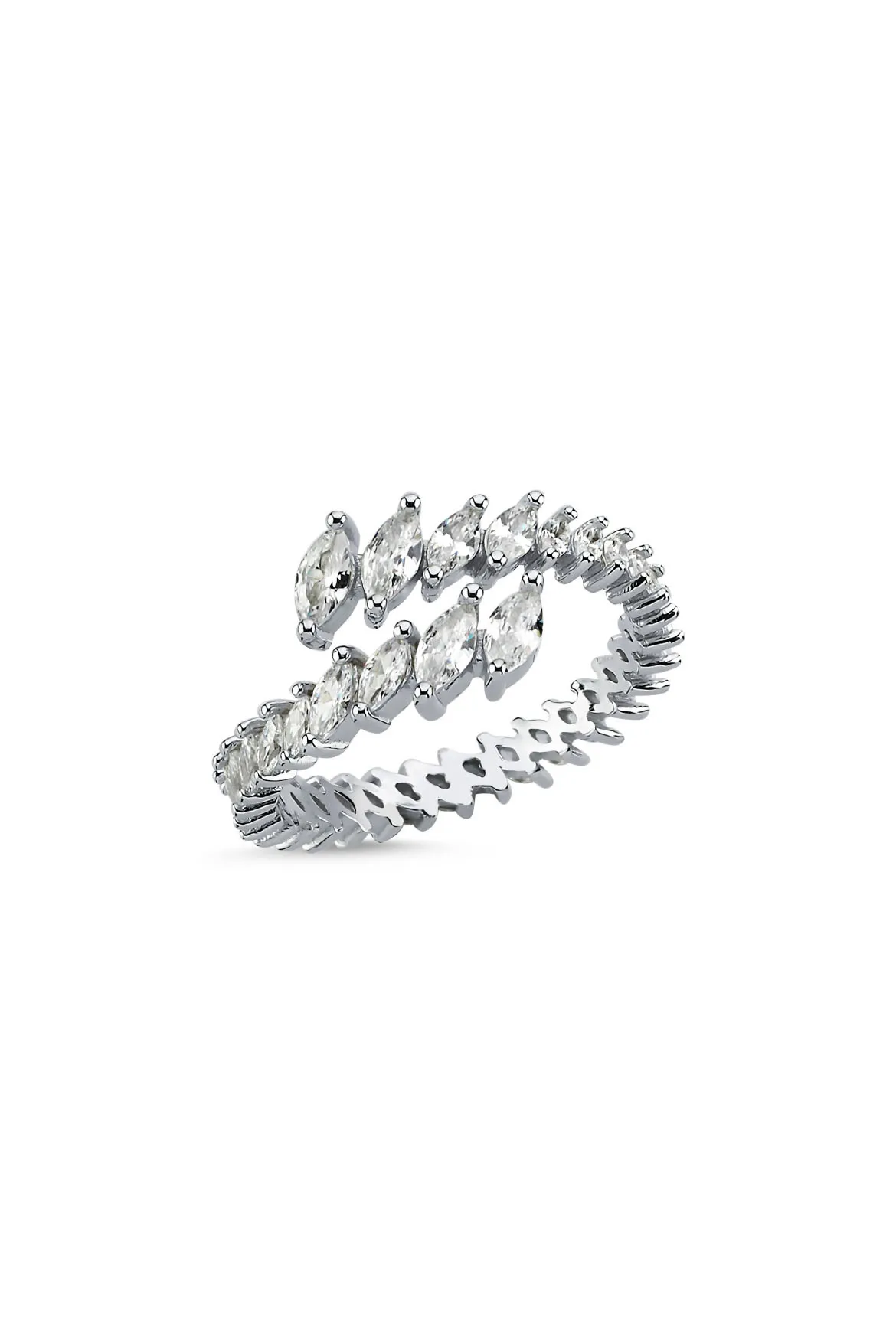 Kraliçelere layık bir şıklık! Mekik kesim zirkon taşların tamtur tasarımla buluştuğu bu özel yüzük, zarif ve asil görünümüyle göz kamaştırıyor. 925 ayar gümüşten üretilen bu şık tasarım, ışığı mükemmel şekilde yansıtan zirkon taşlarıyla pırlanta etkisi yaratıyor.