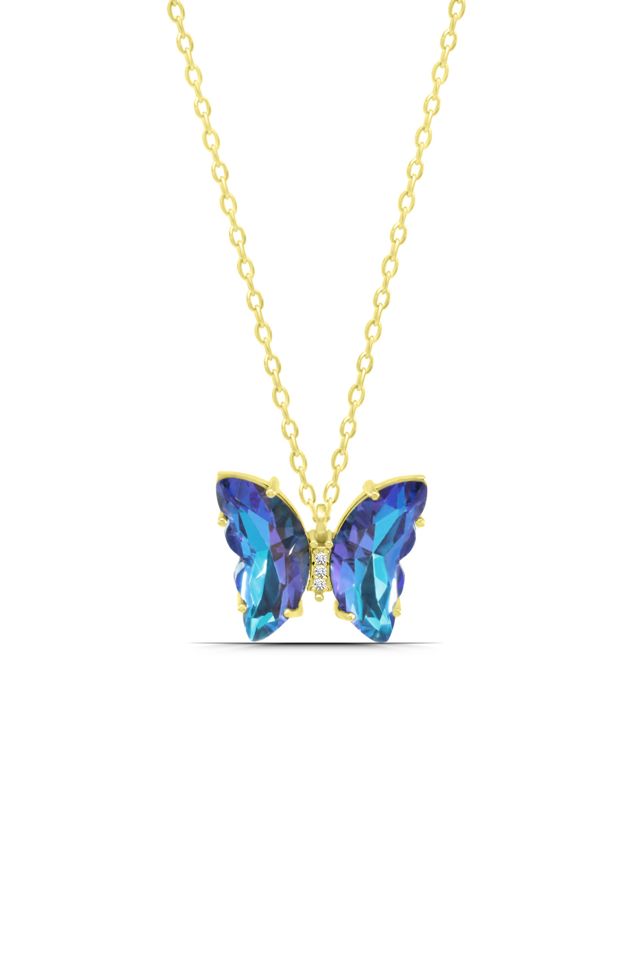 Özel Kesim Mavi Taşlı Büyük Kelebek 925 Ayar Gümüş Kadın Kolye