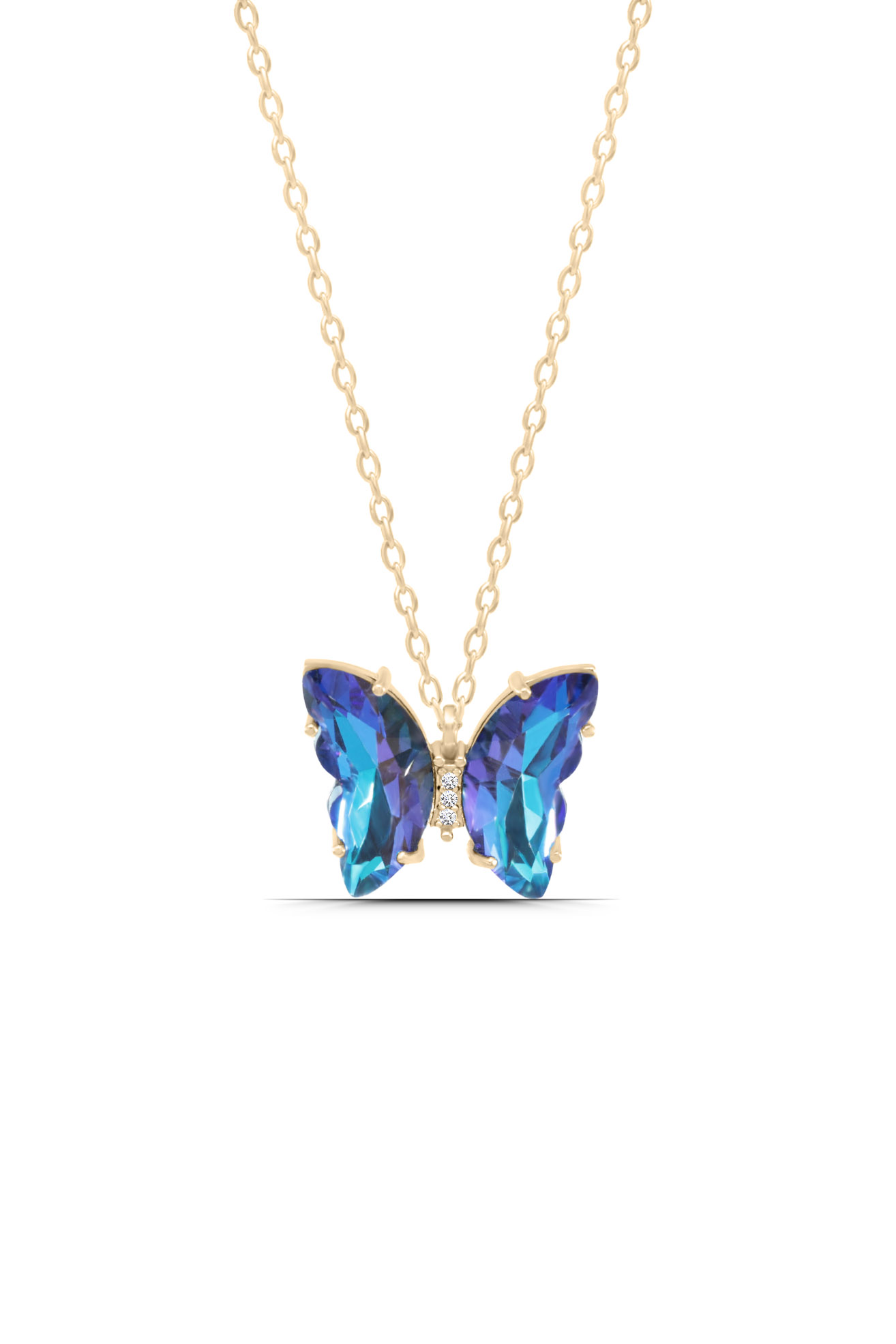 - Kelebek figürü ile tasarlanan bu kolyenin emsalerinden ayrılan en belirgin özelliği her açıdan farklı bir ışıltı ve renkte parlayan özel taşıdır. Kolye tasarlanırken kullanılan bu büyük ve özel kesim taş bakılan her açıdan farklı tonlarda renklerle parlamaktadır. Taşının bu muhteşem özelliğinin yanında üretimde kalite önceliği ön plandadır. Kullanıcısına istediği uzunlukta kullanabilme rahatlığı sağlayan ek uzatmalı zinciri ve kararma önleyici özel kaplaması bu üründede mevcuttur. Özel şık kutusunda özenle paketlenerek gönderilen kelebek tasarım kolye kadınlar için unutulmaz bir hediye olma özelliğine sahiptir.
