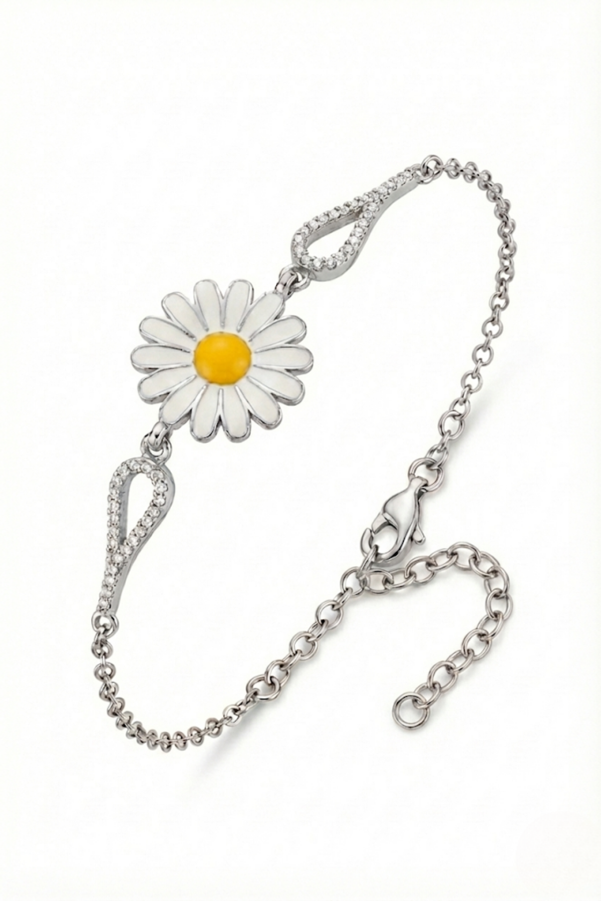 Zarafeti doğadan alan bu papatya tasarım 925 ayar gümüş kadın bileklik, sade ama anlamlı bir stil arayanlar için tasarlandı. Papatyanın saf ve neşeli duruşu, bilekliğin merkezinde yer alan detayla ön plana çıkarken; damla formundaki taşlı bağlantılar tasarıma ince bir ışıltı katıyor. Günlük kombinlerden özel anlara kadar her stile uyum sağlayan bu bileklik, minimal şıklığı güçlü bir sembolle buluşturur.