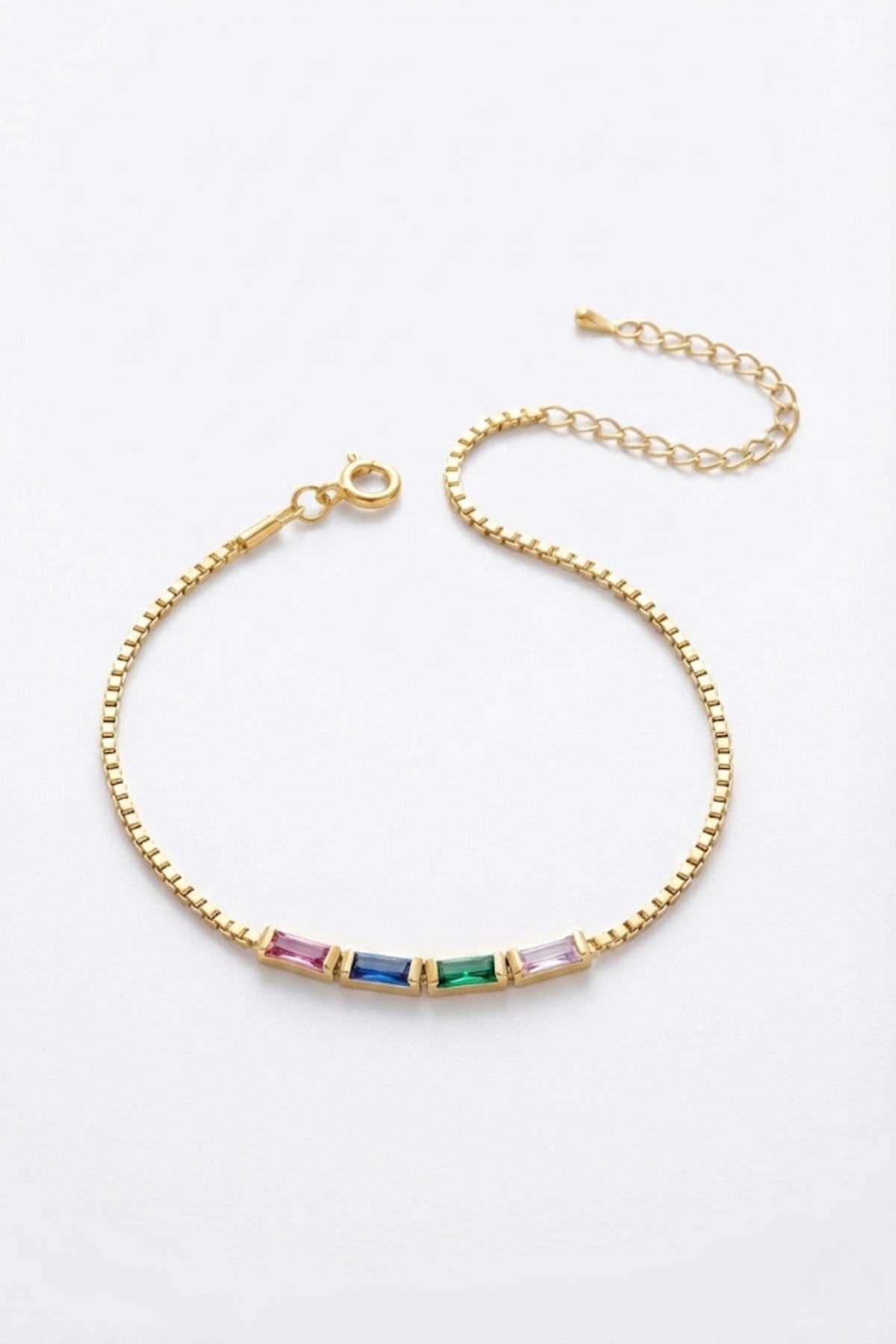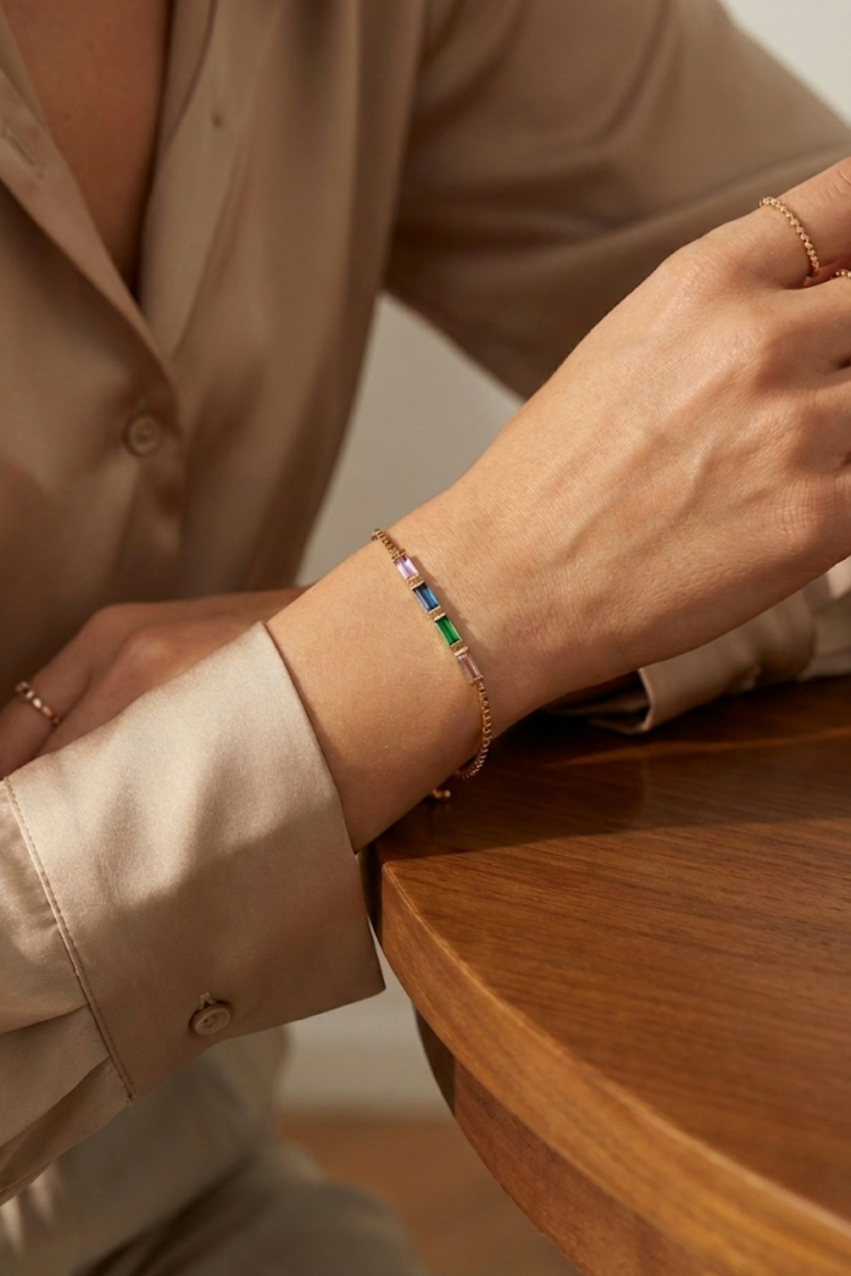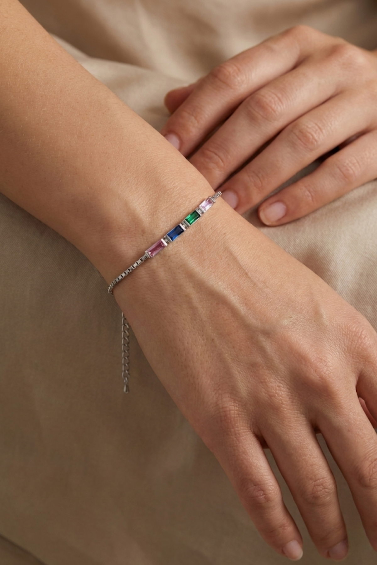 Renkli baget taşların modern ve zarif dizilimiyle tasarlanan bu özel bileklik, zarif bir ışıltı arayanlar için ideal bir seçimdir. Pembe, mavi, yeşil ve lila tonlarındaki baget taşlar bilekte sofistike bir renk geçişi yaratır ve her kombine canlılık katar.
